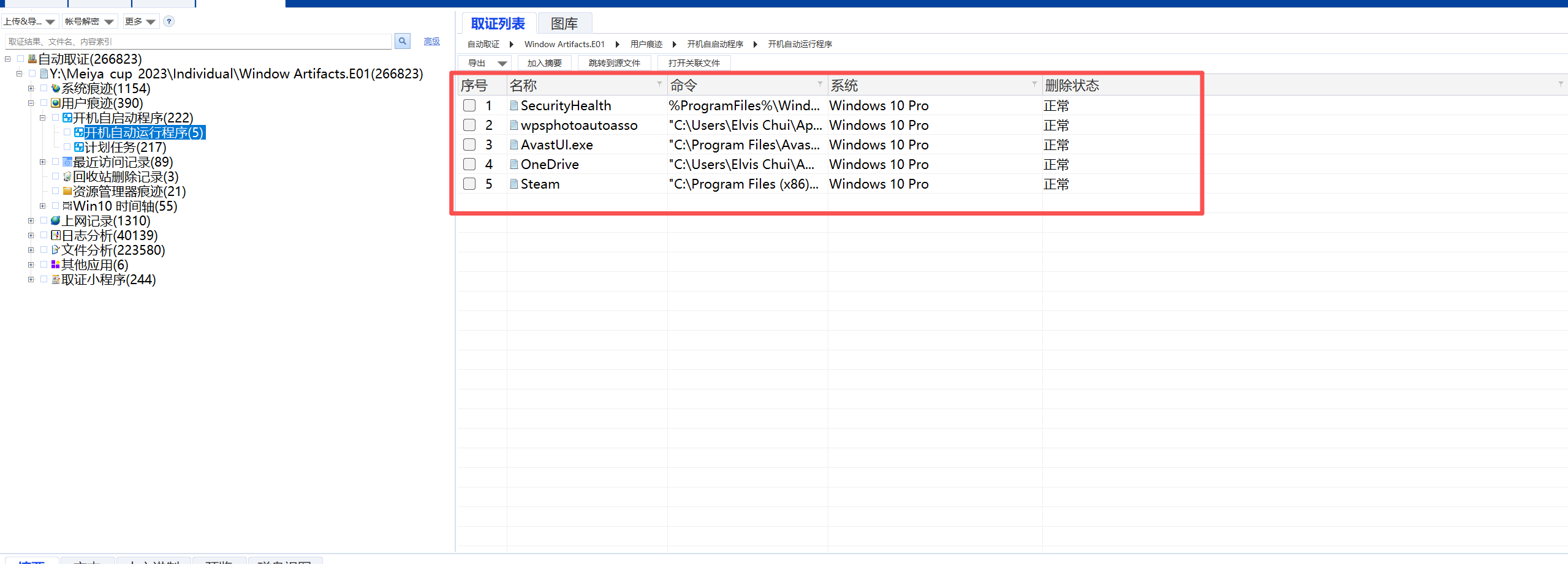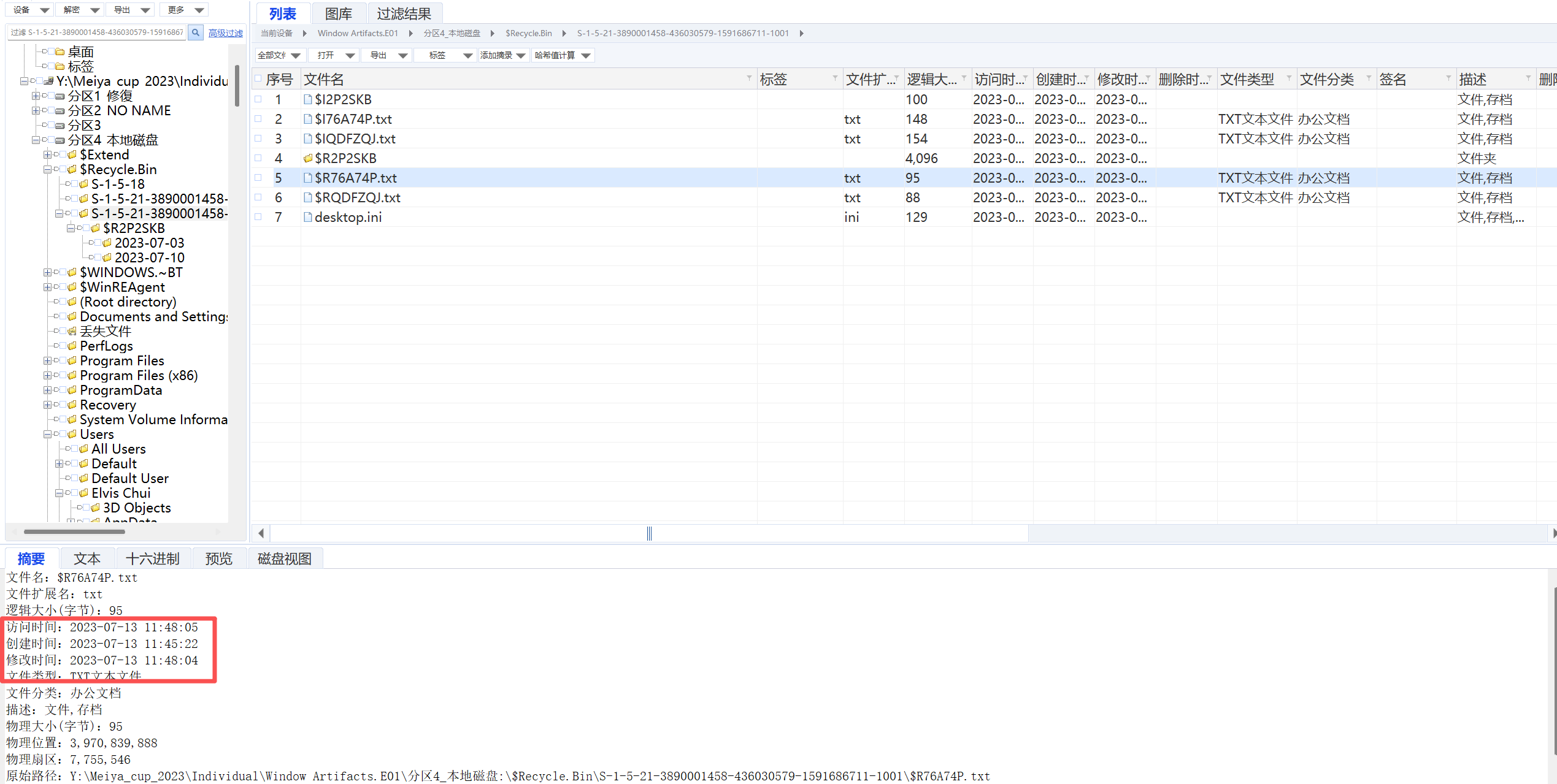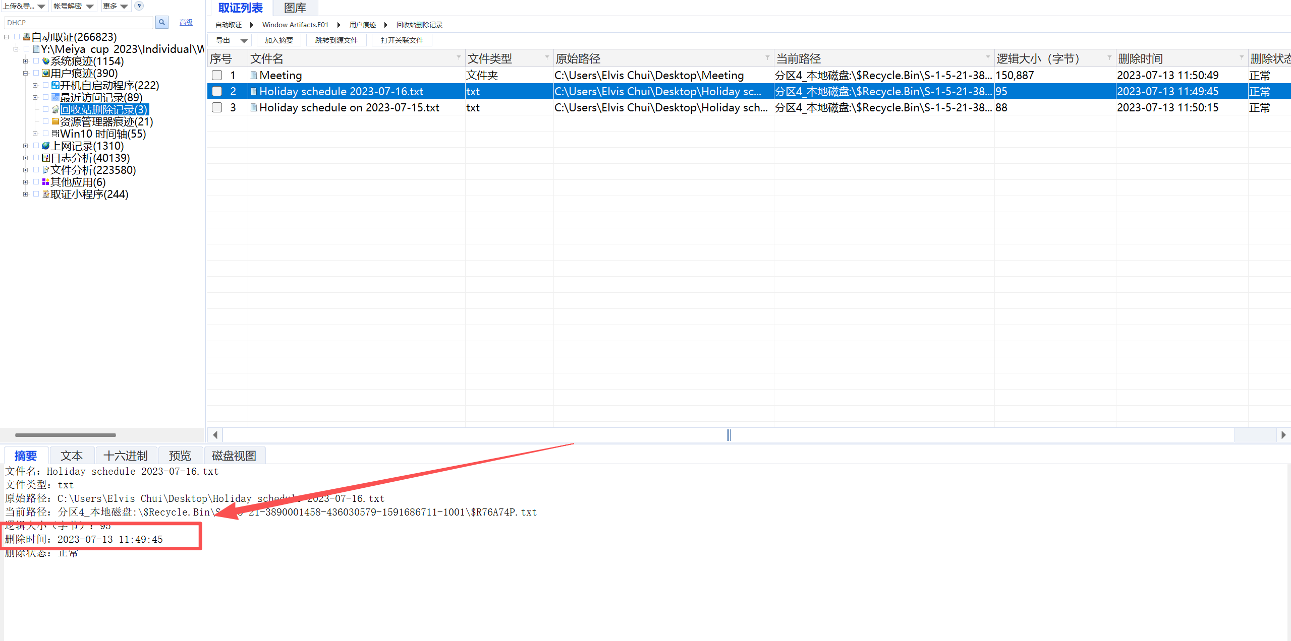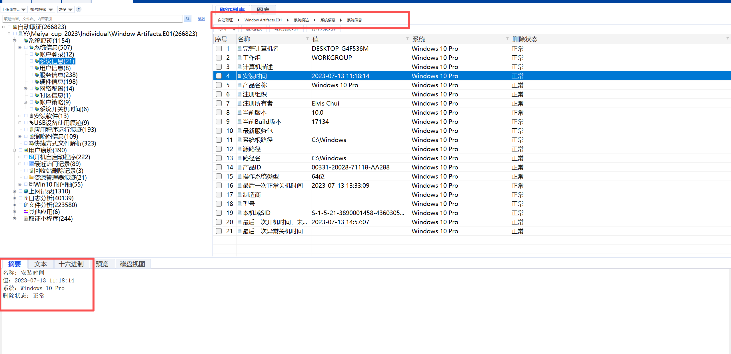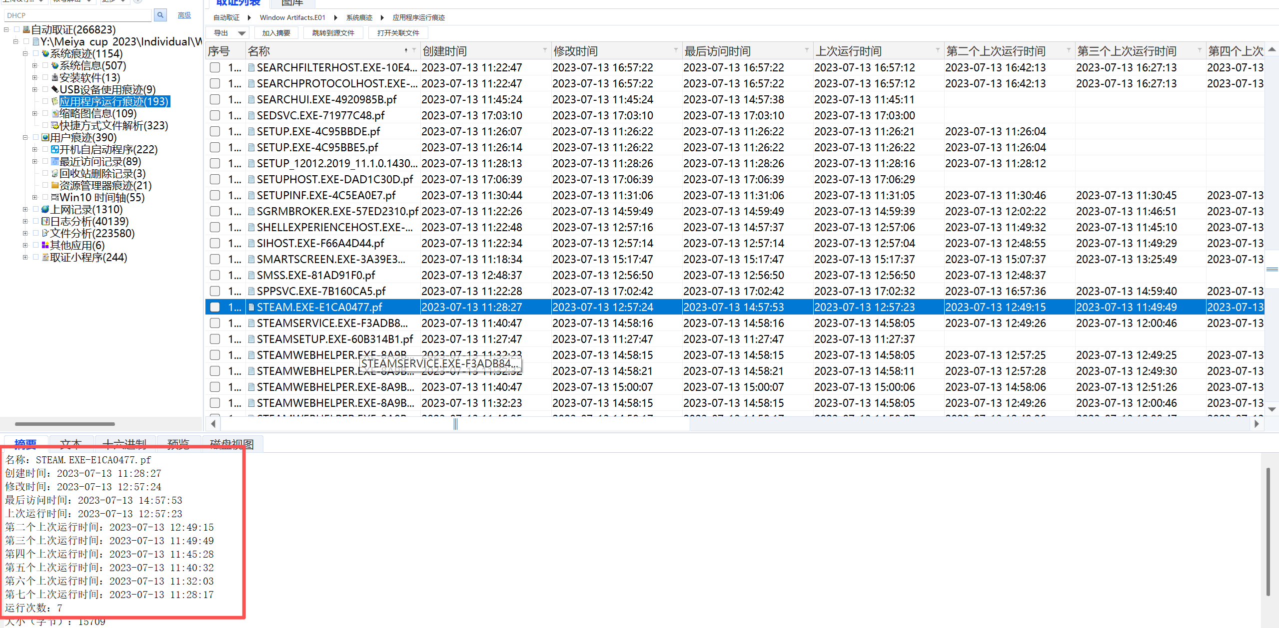 填空题\] Elvis Chui 总共登入过该计算机多少次?根据 'Window Artifacts.E01' 内的Windows 注册表记录 #### 开始查找 从系统痕迹中开始查找 系统痕迹 ---\> 用户信息 ---\> Elvis Chui 发现为11次  ## 2 #### 题目描述: 该计算机的操作系统是在哪一个时区? #### 开始查找 直接从这样查找 系统痕迹 ---\> 系统信息 ---\> 时区信息 是:UTC+8  ## 3 #### 题目描述: 该计算机的操作系统于何时安装?(以计算机系统时区回答) #### 开始查找 直接 系统痕迹 ---\> 系统信息 ---\> 安装时间 是在:2023-07-13 11:18:14  ## 4 #### 题目描述: 哪(几)个程序会于操作系统启动时自动执行? #### 开始查找 直接在 用户痕迹 ---\> 开机自启动程序 ---\> 开机自动运行程序 有以下5个  ## 5 #### 题目描述: 该计算机内安装了以下哪一个程序? A. QQ B. WPS Office C. Opera D. Kaspersky #### 开始查找 直接在 系统痕迹 ---\> 安装软件 ---\> 其他软件 可以看到只有WPS Office有 答案:WPS Office  ## 6 #### 题目描述: 计算机内的OneDrive程序版本是什么? #### 开始查找 还是 系统痕迹 ---\> 安装软件 ---\> 其他软件 可以看到它的版本为: 21.220.1024.0005  ## 7 #### 题目描述: 计算机有一个正在连接的网络接口,该接口连接DHCP服务器的IP地址是多少?提示: 以 IPV4格式回答 #### 开始查找 这里查看 系统痕迹 ---\> 网络配置 ---\> 网络连接 可以发现有一个DHCP服务器,刚好它问的是该接口连接DHCP服务器的IP是多少,那么就是这个 答案:192.168.88.254  ## 8 #### 题目描述: 参考'Window Artifacts.E01'内的Windows注册表回答以下题目,该计算机何时连接过一只U盘?(以计算机系统时区回答) A. 2023-07-13 11:48:26 B. 2023-07-13 03:48:29 C. 2023-07-12 19:48:29 D. 2023-07-13 11:48:29 #### 开始查找 从这里查找 系统痕迹 ---\> USB设备使用痕迹 ---\> 正常的USB设备使用痕迹 上面的Hub是集线器,那么就只有这个了 2023-07-13 11:48:28 时间上有一秒的差异,可能是因为取整策略不同 选择 D 选项  ## 9 #### 题目描述: Elvis Chui 将哪几个文本文件放在回收站中? A:$+D10I76A74P.txt B:Holiday schedule 2023-07-16.txt C:Holiday schedule 2023-07-13.txt D:Minute on 2023-07-01.txt E:Minute on 2023-07-10.txt #### 开始查找 直接在 用户痕迹 ---\> 回收站删除记录 中查找  但是这里的meeting文件无法打开,跳转到源文件看一下  到这个文件夹下了,打开看看  有个7月3号和10号的文件夹,看看10号的 3号的都是选项中没有的文件所以就不管了,看到10号的中有一个是选项中的  答案:BE ## 10 #### 题目描述: Elvis Chui在什么时间删除了第一个文本文件?(以计算机系统时区回答) A. 2023-07-13 11:50:15 B. 2023-07-13 03:49:45 C. 2023-07-13 03:50:15 D. 2023-07-13 11:49:45 #### 开始查找 上题的第一个文本文件是Holiday schedule 2023-07-16.txt 那么直接看它的删除时间是多少 答案:2023-07-13 11:49:45  ## 11 #### 题目描述: Elvis Chui删除的第一个文本文件的文件名是什么?提示: 请用小写字母回答及需列明文件格式。如文件名字内有空格位置,请用_标示。例如: go_to_school.docx #### 开始查找 还是和上题一样的文件,只不过是文件名了 答案:holiday_schedule_2023-07-16.txt  ## 12 #### 题目描述: Elvis Chui删除的第一个文本文件在什么时间创建?(以计算机系统时区回答) A. 2023-07-13_11:42:39 B. 2023-07-13_11:50:49 C. 2023-07-13_11:49:45 D. 2023-07-13_11:45:22 #### 开始查找 在这里看不到创建时间,跳转到源文件 可以看到创建时间为 2023-07-13 11:45:22 选择D选项  ## 13 #### 题目描述: Elvis Chui计划于2023年7月15日20点5分有什么活动?提示: 答案请与文件内的文字与大细阶相同 #### 开始查找 找了一圈没发现7月15号的文件,但是突然一想,回收站里的那个名字就是写的7月15,打开看一下,看看是不是活动策划,发现还真是  答案就是2005的:Movie ## 14 #### 题目描述: 该计算机执行STEAM.EXE总共多少次?提示: 请用阿拉伯数字作答 #### 开始查找 直接在 系统痕迹 ---\> 应用程序运行痕迹 ---\> STEAM.EXE 下面会显示运行的时间和次数 答案:7