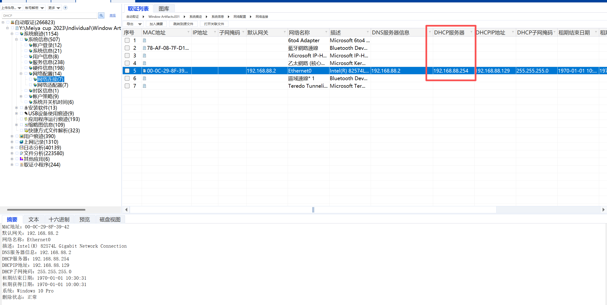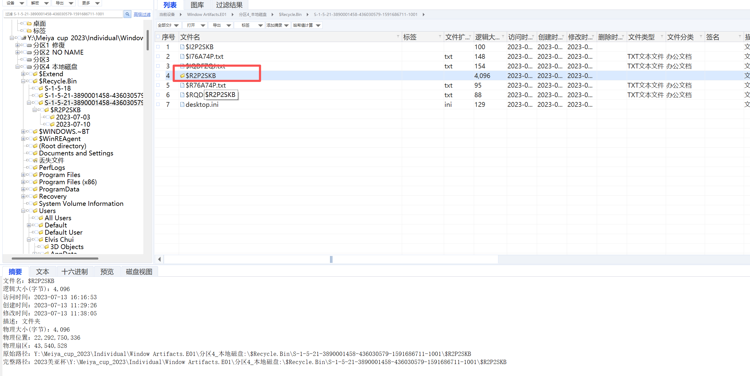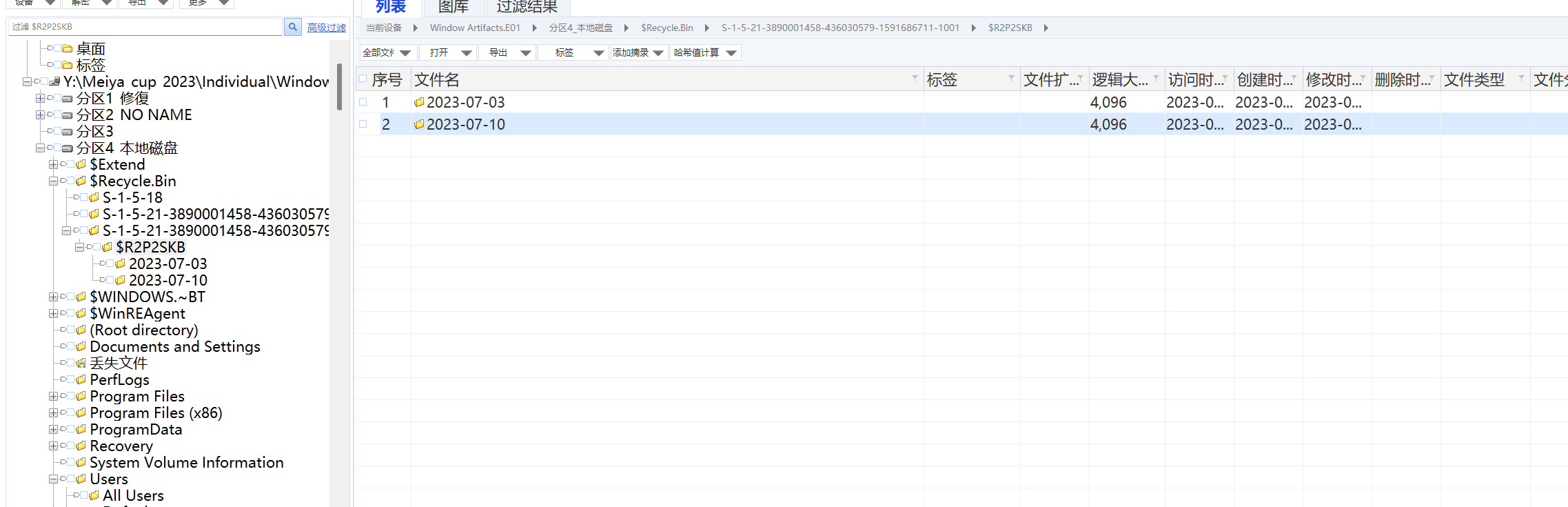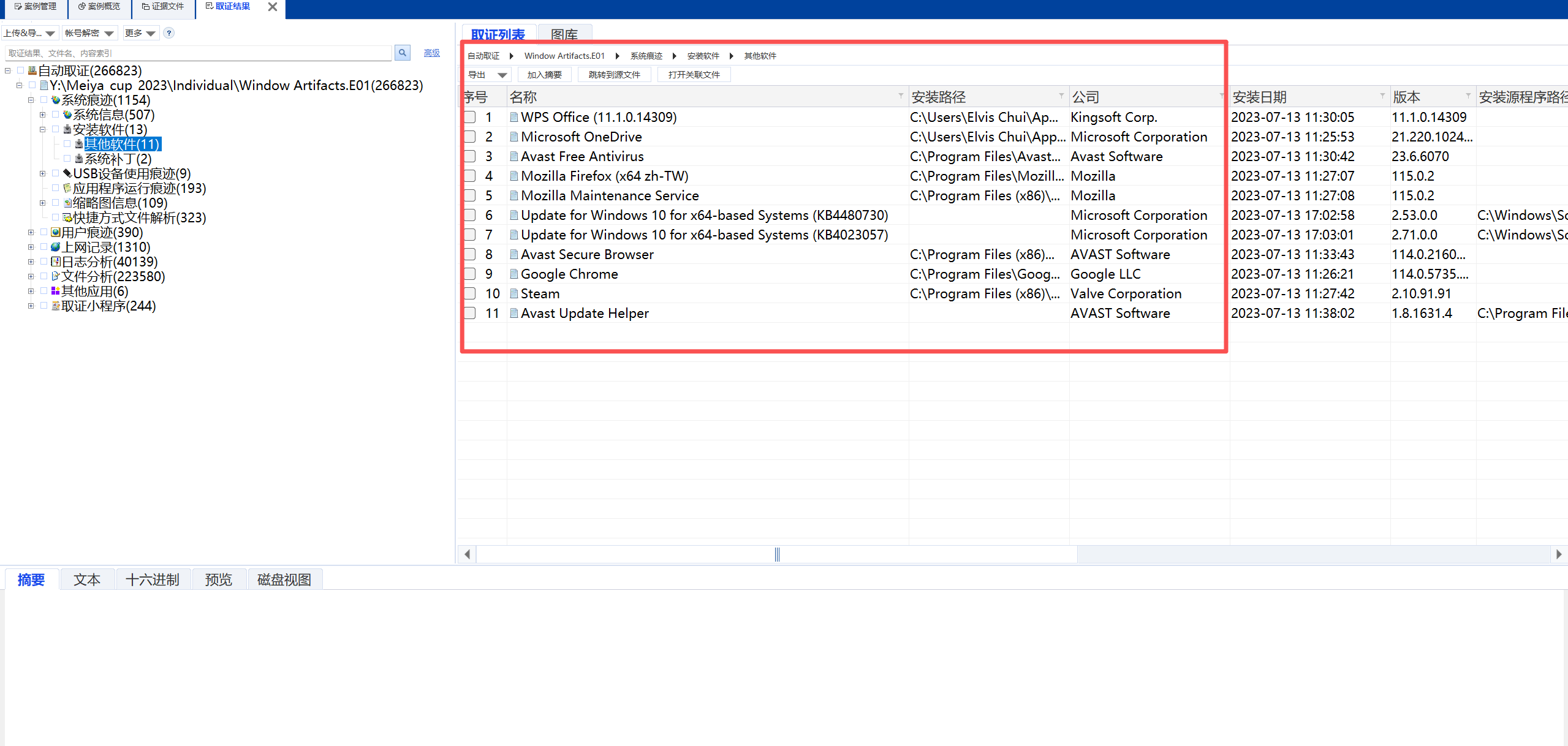 填空题\] Elvis Chui 总共登入过该计算机多少次?根据 'Window Artifacts.E01' 内的Windows 注册表记录 #### 开始查找 从系统痕迹中开始查找 系统痕迹 ---\> 用户信息 ---\> Elvis Chui 发现为11次  ## 2 #### 题目描述: 该计算机的操作系统是在哪一个时区? #### 开始查找 直接从这样查找 系统痕迹 ---\> 系统信息 ---\> 时区信息 是:UTC+8  ## 3 #### 题目描述: 该计算机的操作系统于何时安装?(以计算机系统时区回答) #### 开始查找 直接 系统痕迹 ---\> 系统信息 ---\> 安装时间 是在:2023-07-13 11:18:14  ## 4 #### 题目描述: 哪(几)个程序会于操作系统启动时自动执行? #### 开始查找 直接在 用户痕迹 ---\> 开机自启动程序 ---\> 开机自动运行程序 有以下5个  ## 5 #### 题目描述: 该计算机内安装了以下哪一个程序? A. QQ B. WPS Office C. Opera D. Kaspersky #### 开始查找 直接在 系统痕迹 ---\> 安装软件 ---\> 其他软件 可以看到只有WPS Office有 答案:WPS Office  ## 6 #### 题目描述: 计算机内的OneDrive程序版本是什么? #### 开始查找 还是 系统痕迹 ---\> 安装软件 ---\> 其他软件 可以看到它的版本为: 21.220.1024.0005  ## 7 #### 题目描述: 计算机有一个正在连接的网络接口,该接口连接DHCP服务器的IP地址是多少?提示: 以 IPV4格式回答 #### 开始查找 这里查看 系统痕迹 ---\> 网络配置 ---\> 网络连接 可以发现有一个DHCP服务器,刚好它问的是该接口连接DHCP服务器的IP是多少,那么就是这个 答案:192.168.88.254  ## 8 #### 题目描述: 参考'Window Artifacts.E01'内的Windows注册表回答以下题目,该计算机何时连接过一只U盘?(以计算机系统时区回答) A. 2023-07-13 11:48:26 B. 2023-07-13 03:48:29 C. 2023-07-12 19:48:29 D. 2023-07-13 11:48:29 #### 开始查找 从这里查找 系统痕迹 ---\> USB设备使用痕迹 ---\> 正常的USB设备使用痕迹 上面的Hub是集线器,那么就只有这个了 2023-07-13 11:48:28 时间上有一秒的差异,可能是因为取整策略不同 选择 D 选项  ## 9 #### 题目描述: Elvis Chui 将哪几个文本文件放在回收站中? A:$+D10I76A74P.txt B:Holiday schedule 2023-07-16.txt C:Holiday schedule 2023-07-13.txt D:Minute on 2023-07-01.txt E:Minute on 2023-07-10.txt #### 开始查找 直接在 用户痕迹 ---\> 回收站删除记录 中查找  但是这里的meeting文件无法打开,跳转到源文件看一下  到这个文件夹下了,打开看看  有个7月3号和10号的文件夹,看看10号的 3号的都是选项中没有的文件所以就不管了,看到10号的中有一个是选项中的  答案:BE ## 10 #### 题目描述: Elvis Chui在什么时间删除了第一个文本文件?(以计算机系统时区回答) A. 2023-07-13 11:50:15 B. 2023-07-13 03:49:45 C. 2023-07-13 03:50:15 D. 2023-07-13 11:49:45 #### 开始查找 上题的第一个文本文件是Holiday schedule 2023-07-16.txt 那么直接看它的删除时间是多少 答案:2023-07-13 11:49:45  ## 11 #### 题目描述: Elvis Chui删除的第一个文本文件的文件名是什么?提示: 请用小写字母回答及需列明文件格式。如文件名字内有空格位置,请用_标示。例如: go_to_school.docx #### 开始查找 还是和上题一样的文件,只不过是文件名了 答案:holiday_schedule_2023-07-16.txt  ## 12 #### 题目描述: Elvis Chui删除的第一个文本文件在什么时间创建?(以计算机系统时区回答) A. 2023-07-13_11:42:39 B. 2023-07-13_11:50:49 C. 2023-07-13_11:49:45 D. 2023-07-13_11:45:22 #### 开始查找 在这里看不到创建时间,跳转到源文件 可以看到创建时间为 2023-07-13 11:45:22 选择D选项  ## 13 #### 题目描述: Elvis Chui计划于2023年7月15日20点5分有什么活动?提示: 答案请与文件内的文字与大细阶相同 #### 开始查找 找了一圈没发现7月15号的文件,但是突然一想,回收站里的那个名字就是写的7月15,打开看一下,看看是不是活动策划,发现还真是  答案就是2005的:Movie ## 14 #### 题目描述: 该计算机执行STEAM.EXE总共多少次?提示: 请用阿拉伯数字作答 #### 开始查找 直接在 系统痕迹 ---\> 应用程序运行痕迹 ---\> STEAM.EXE 下面会显示运行的时间和次数 答案:7