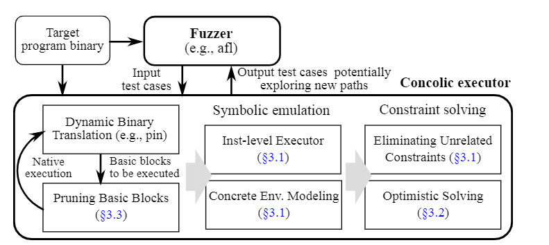 计算机科学界已开发出两种显著的技术来自动发现软件漏洞:覆盖引导模糊测试与混合执行。模糊测试能以接近原生速度快速探索输入空间,但其仅擅长发现导致宽松分支条件执行路径的输入。相反,混合执行擅长寻找驱动程序进入严苛复杂分支条件的输入,但其在构建约束条件与求解过程中消耗巨大且速度缓慢。