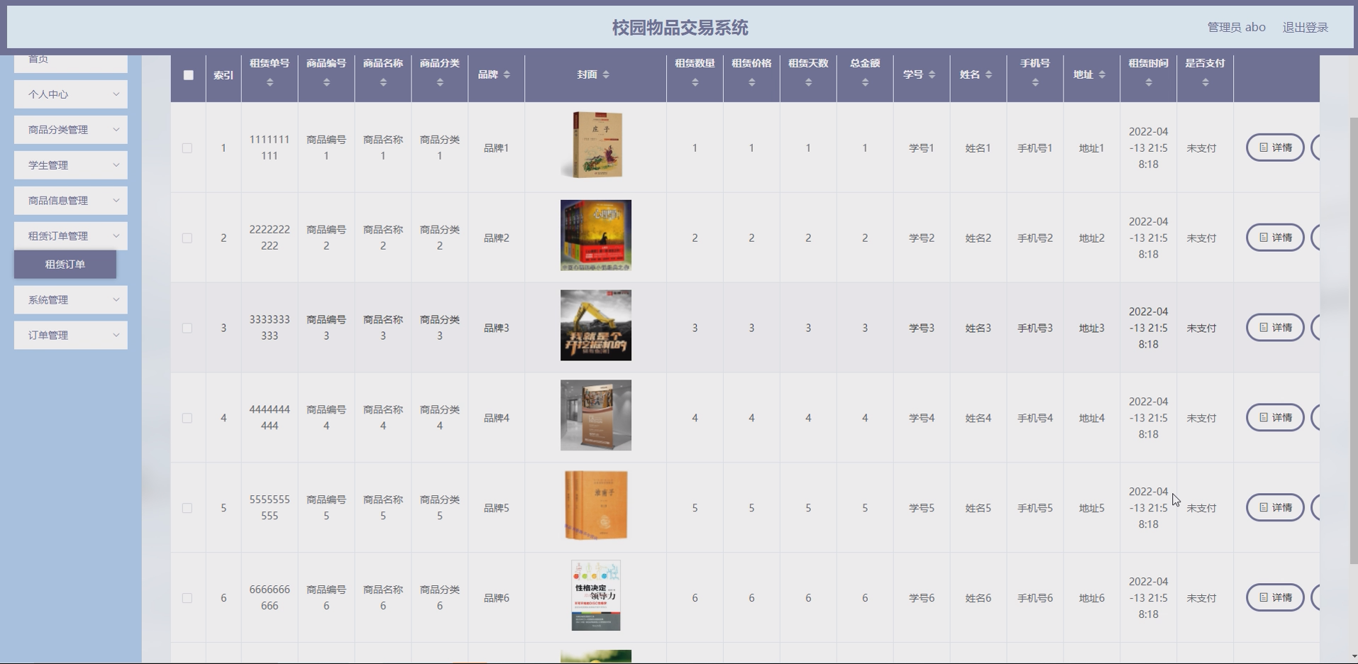 1套基于SSM框架的校园物品交易系统,实现商品分类、学生管理、商品信息管理、租赁订单管理等核心功能,支持学生与管理员两类用户的正常使用。