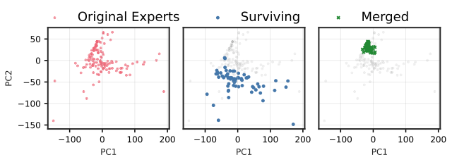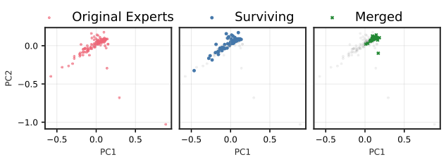 作者用 PCA 可视化显示:在高层 MoE 中,Merging 会把专家输出子空间强行拉到中心,出现 "functional subspace collapse";Pruning 则保留原来的 manifold 结构。