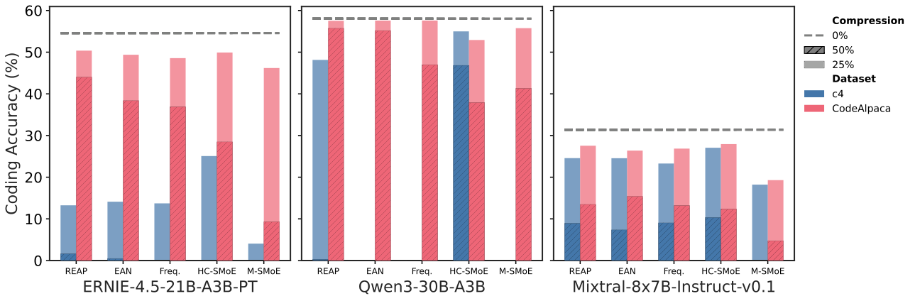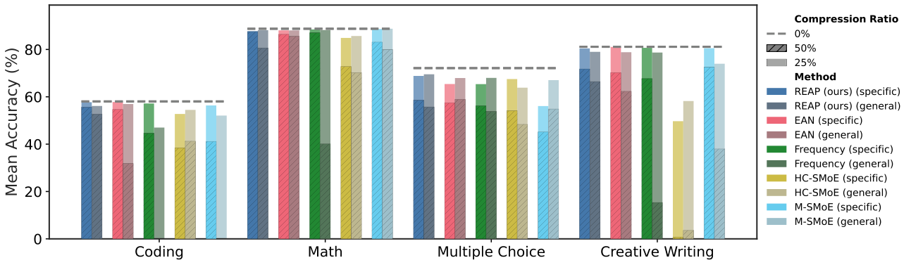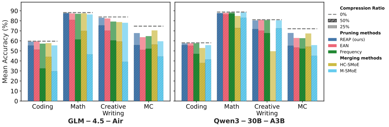 图解:GLM-4.5-Air 与 Qwen3-30B 在多任务上的压缩效果。50% 压缩时,Merging 在生成类任务上明显下滑,REAP 保持最好稳定性。