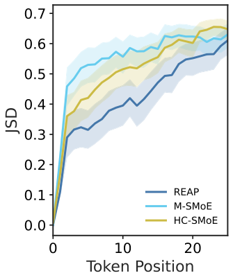 图解:logit JSD 随 token 位置变化。Merging 随序列增长快速失配,REAP 更稳。
