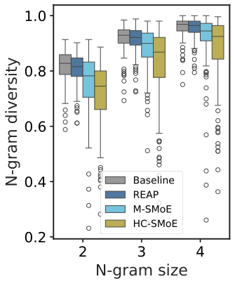 图解:N-gram 多样性。Merging 输出显著更重复,REAP 接近原模型。