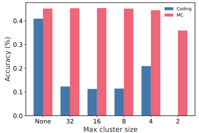 图解:限制最大 cluster size 后,编码任务准确率大幅下降,说明大簇是性能崩溃来源。