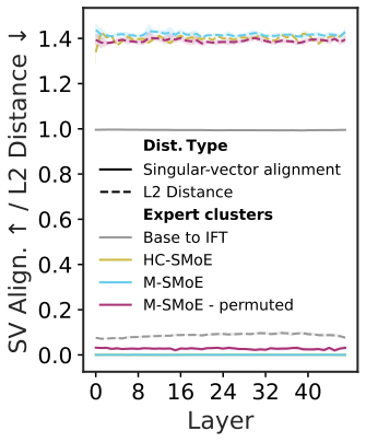 图解:专家权重间距离和奇异向量对齐度。专家之间差异大,导致 Merging 的"参数平均"本身就不稳定。