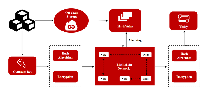 除此之外,还通过量子重加密技术,确保链下存储的数据在传输和存储过程中始终处于加密状态,且加密密钥的生成与分发遵循量子安全原则。同时,利用区块链的不可篡改性记录链下数据的哈希值,形成双重保护机制,进一步提升数据安全性。