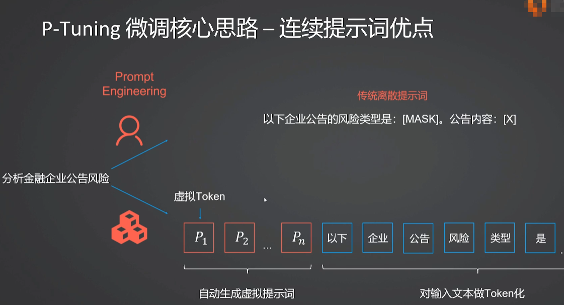 | 特性 | 传统离散提示词 (人工编写) | P-Tuning 虚拟 Token |