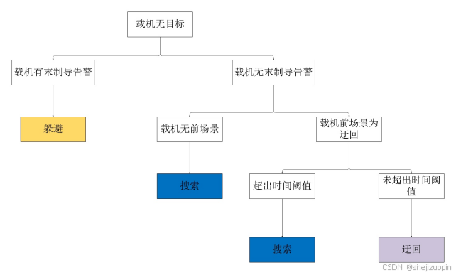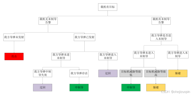 通过参与老师的项目,以及对空战知识的相关学习,目前形成了基于杀伤链以及OODA环的一套1v1循环作战方案,将原有杀伤链简化,形成了基于搜索、攻击、中制导、躲避、迂回五种模式循环作战方案,通过阅读大量文献,发现多数文献没有对完整的空战对局进行改进,而是局限于优化空战中的某一处问题,并且大部分的文献中都使用了强化学习,但是在使用强化学习时往往都忽略掉了飞机的安全问题,也只局限在仿真环节,由于强化学习的不可解释性,强化学习时常输出一些从人的角度看来无法理解的行为,而强化学习又需要采取动作与环境进行交互,否则就没办法构成马尔科夫决策过程,无法实现算法中部分参数的更新。目前已取得的成果为基于专家经验的单机循环空战方法。基于专家经验的程序架构如下图所示: