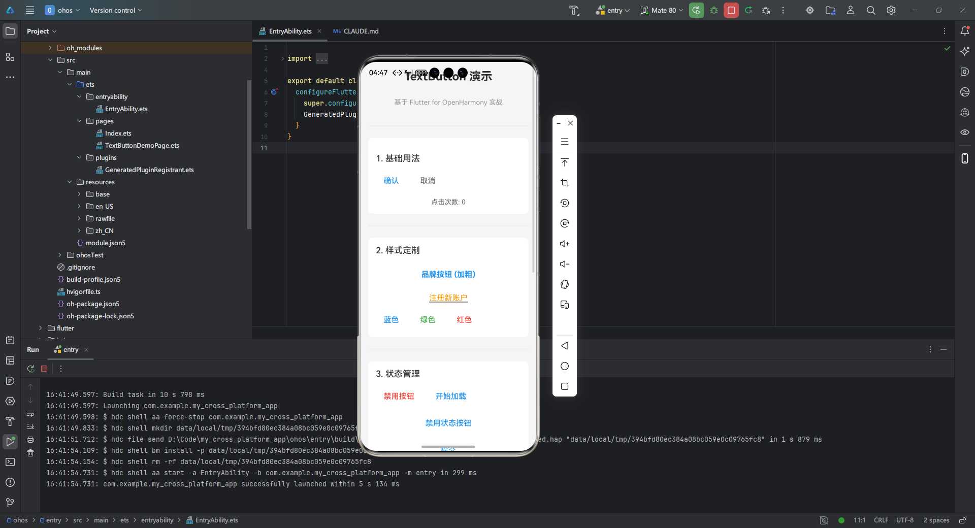 这段代码创建了最基本的文本按钮,点击时在控制台输出日志。在 OpenHarmony 平台上运行时,需要注意: