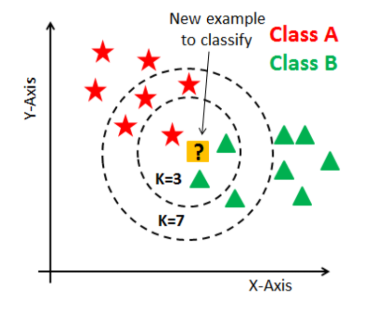 对于一个待预测的样本,KNN 会在训练数据集中找到与它 "最相似"(距离最近)的 K 个样本,然后根据这 K 个样本的标签,通过 "投票" 的方式决定待预测样本的类别(分类任务),或取平均值作为预测值(回归任务)。