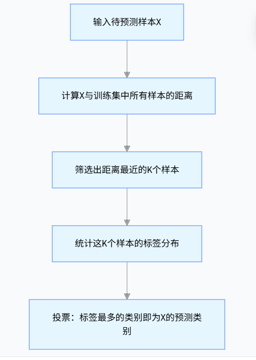 分类任务:统计 K 个邻居中各类别频次,频次最高的类别即为预测结果。