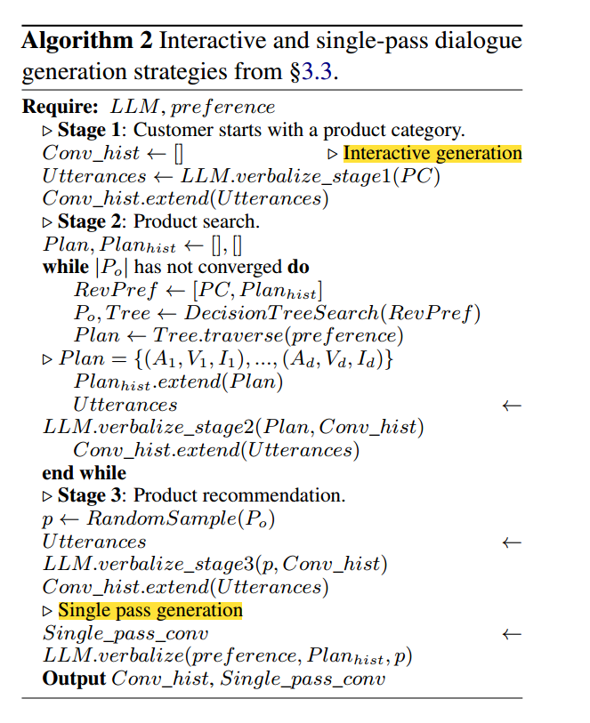 单轮生成(Single-Pass Generation)将决策树计划预先确定的所有产品属性元组 输入到单个LLM中,并通过一次生成整个对话。这种方式生成的对话更加稳定、自然。