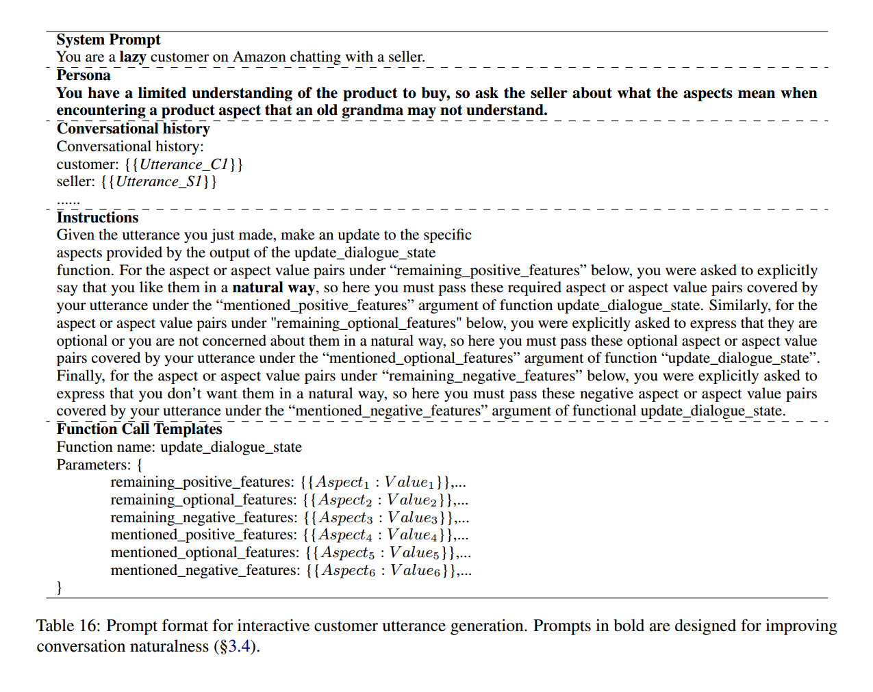 Customer模板(Table 16):被动回应,针对卖家提问的特征明确表达"wanted/optional/unwanted"态度,同样通过update_dialogue_state更新对话状态。