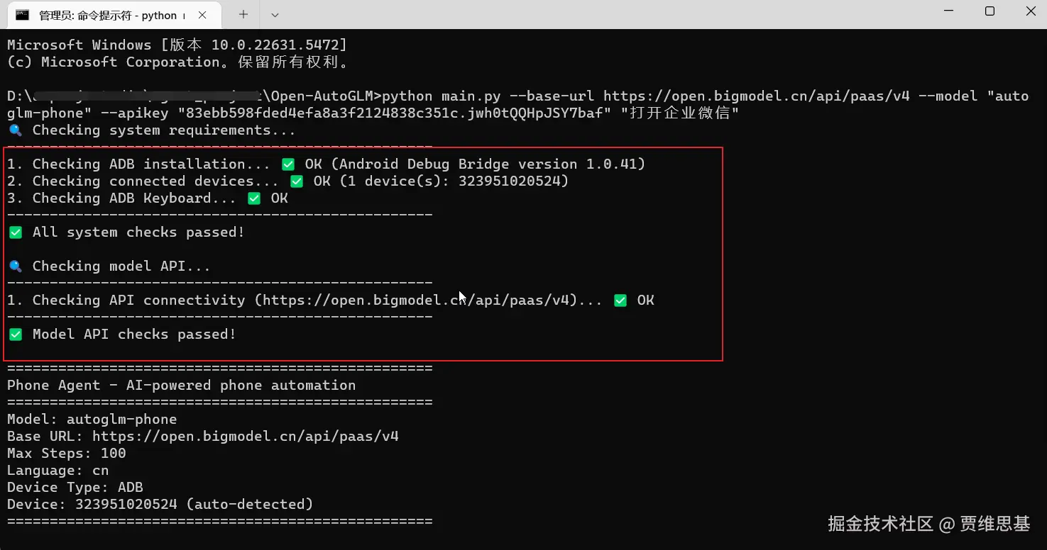 python main.py --base-url https://open.bigmodel.cn/api/paas/v4 --model "autoglm-phone" --apikey "这里填之前注册的API Key" "这里填要执行的操作,比如打开企业微信"