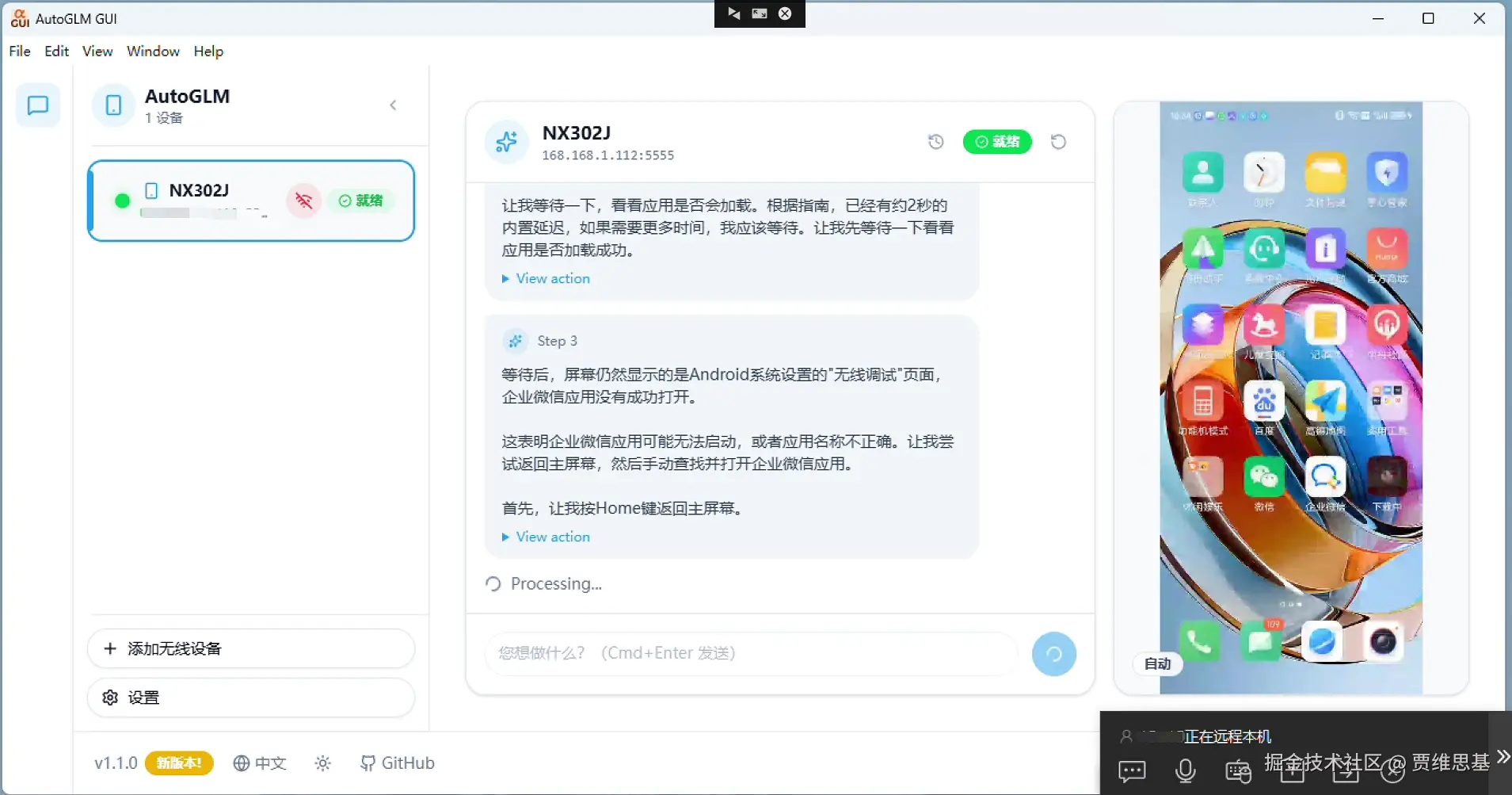 整个界面的布局非常简洁清晰,左侧是连接的设备信息,中间是AutoGLM的思考过程,右侧是手机的实时画面。