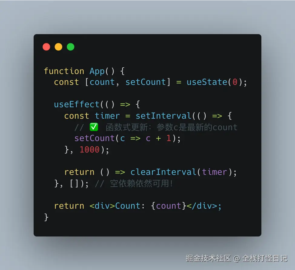 setState(prev => prev + 1)是避开闭包陷阱的 "万能钥匙"; - 空依赖要谨慎 :空依赖的