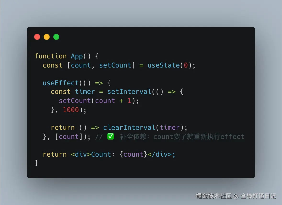 useEffect里,尽量避免直接引用 state/props,改用函数式更新; - 依赖数组要写全 :如果必须依赖外部变量,一定要把变量加入依赖数组(配合 ESLint 的