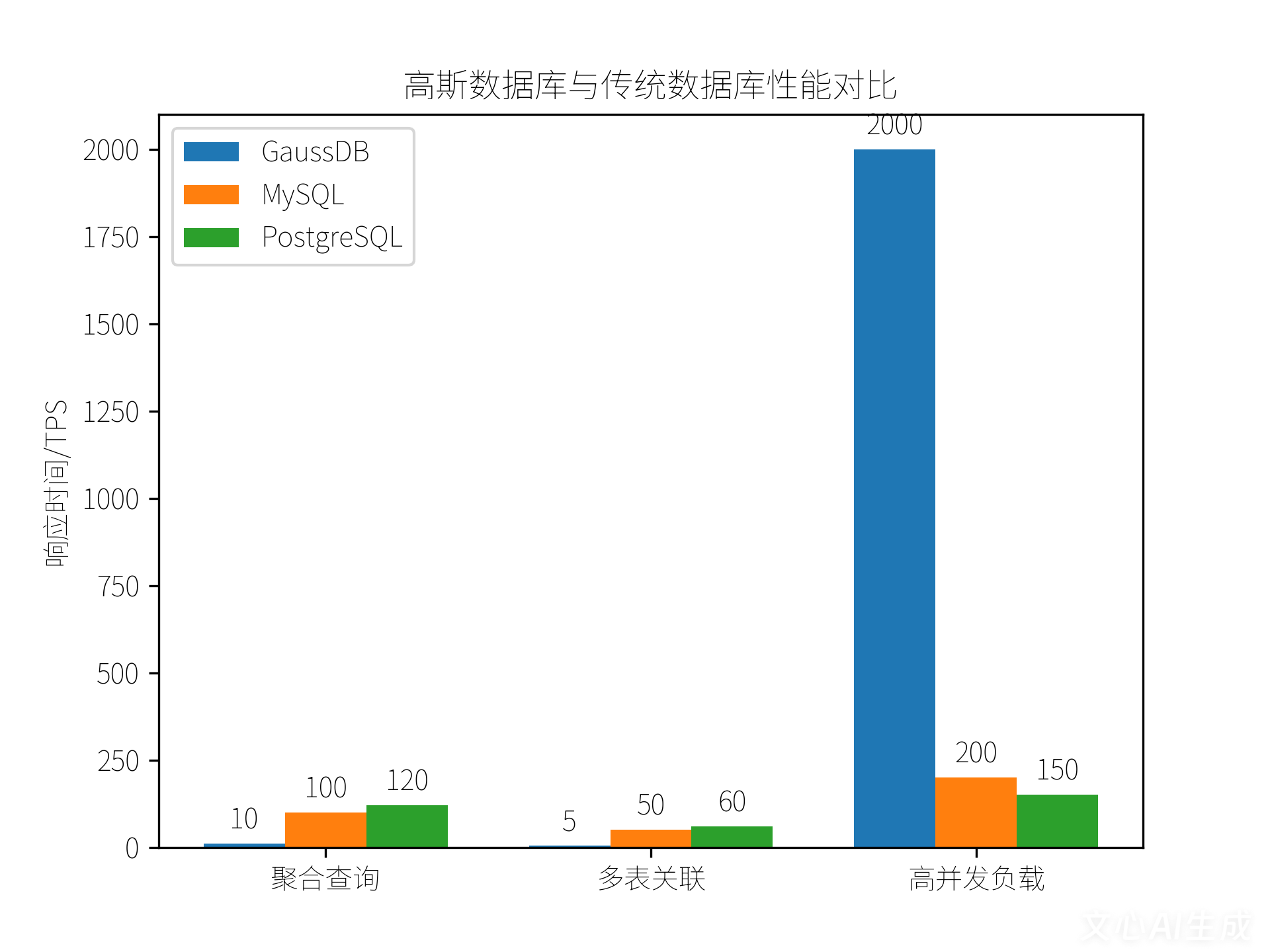 (性能对比柱状图显示,高斯数据库在聚合查询、多表关联和高并发负载场景全面领先)。