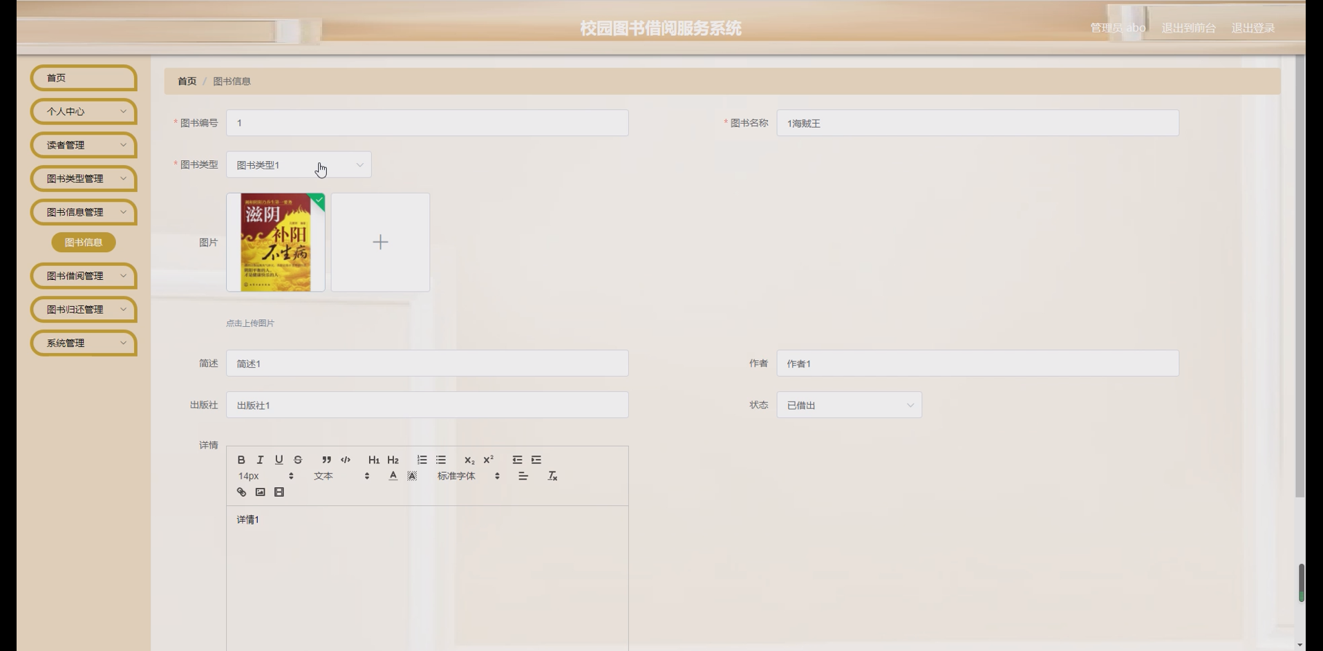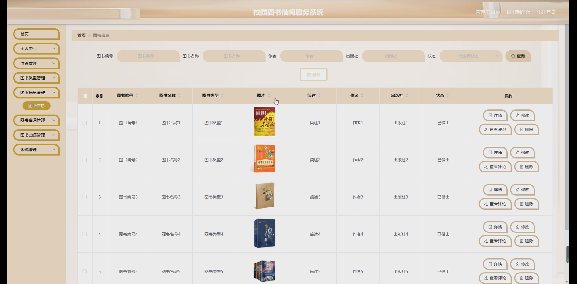 图书信息管理模块:实现图书信息的录入、修改、删除与查询功能。管理员可上传图书封面、填写书名、作者、ISBN号、出版社、出版日期、所属类型、库存数量等信息,支持按多条件组合查询图书。