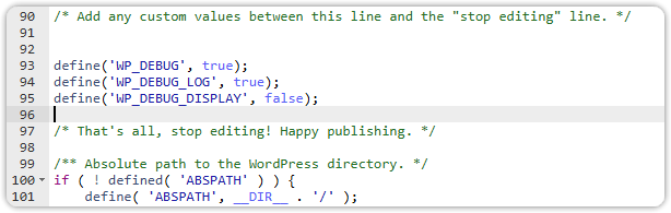 | define('WP_DEBUG', true ); define('WP_DEBUG_LOG', true ); define('WP_DEBUG_DISPLAY', false ); |