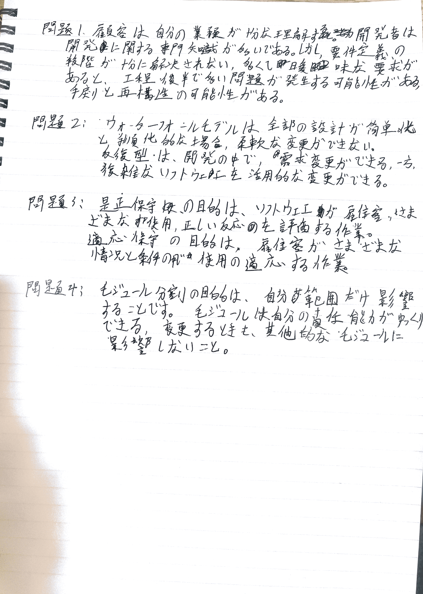 ウォーターフォールモデルと比較した場合の,反復型(イテレーティブ)開発プロセスの特徴を1つ述べ,その理由を説明せよ。