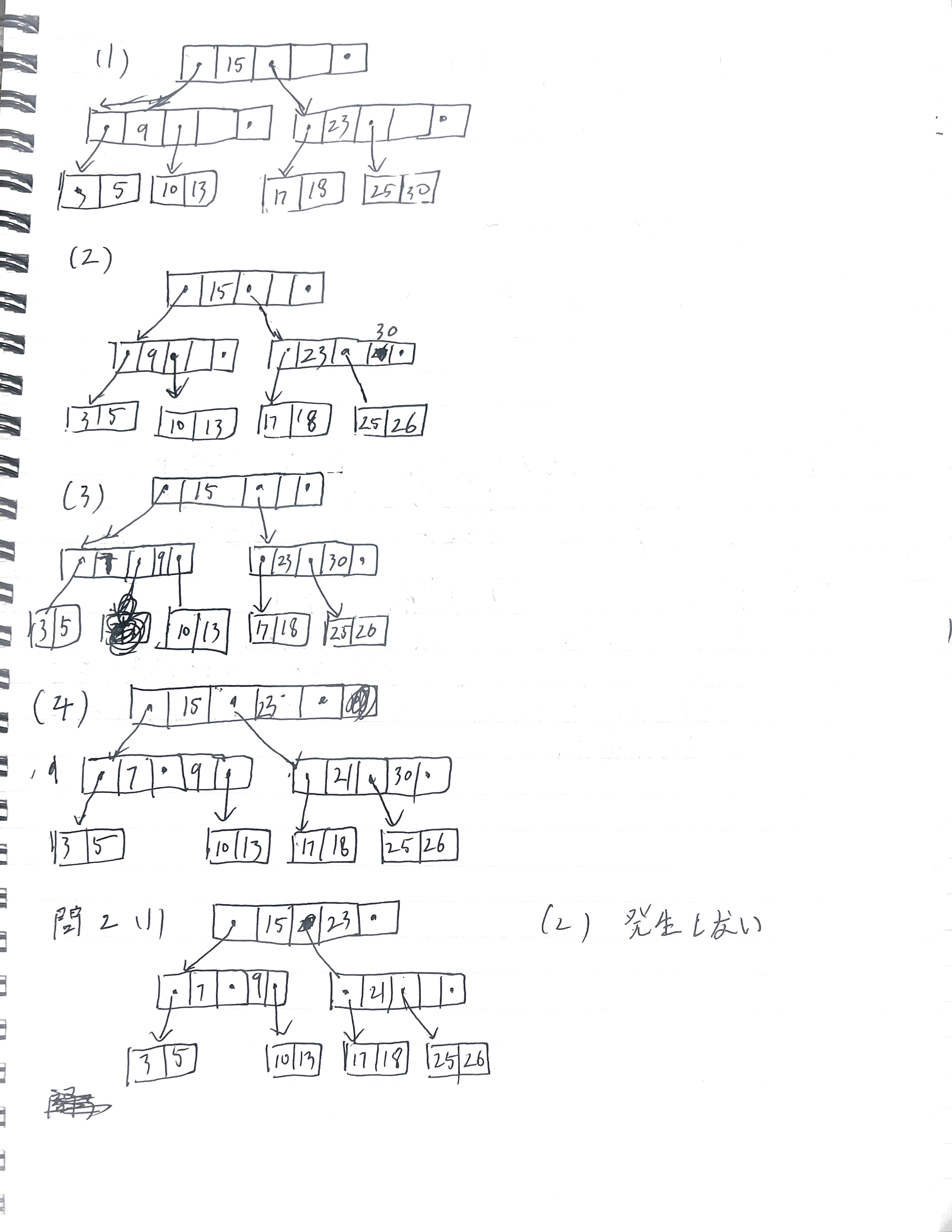 次に示す 2 次の B 木 に対して,以下の操作を この順に 行った後の B 木を,