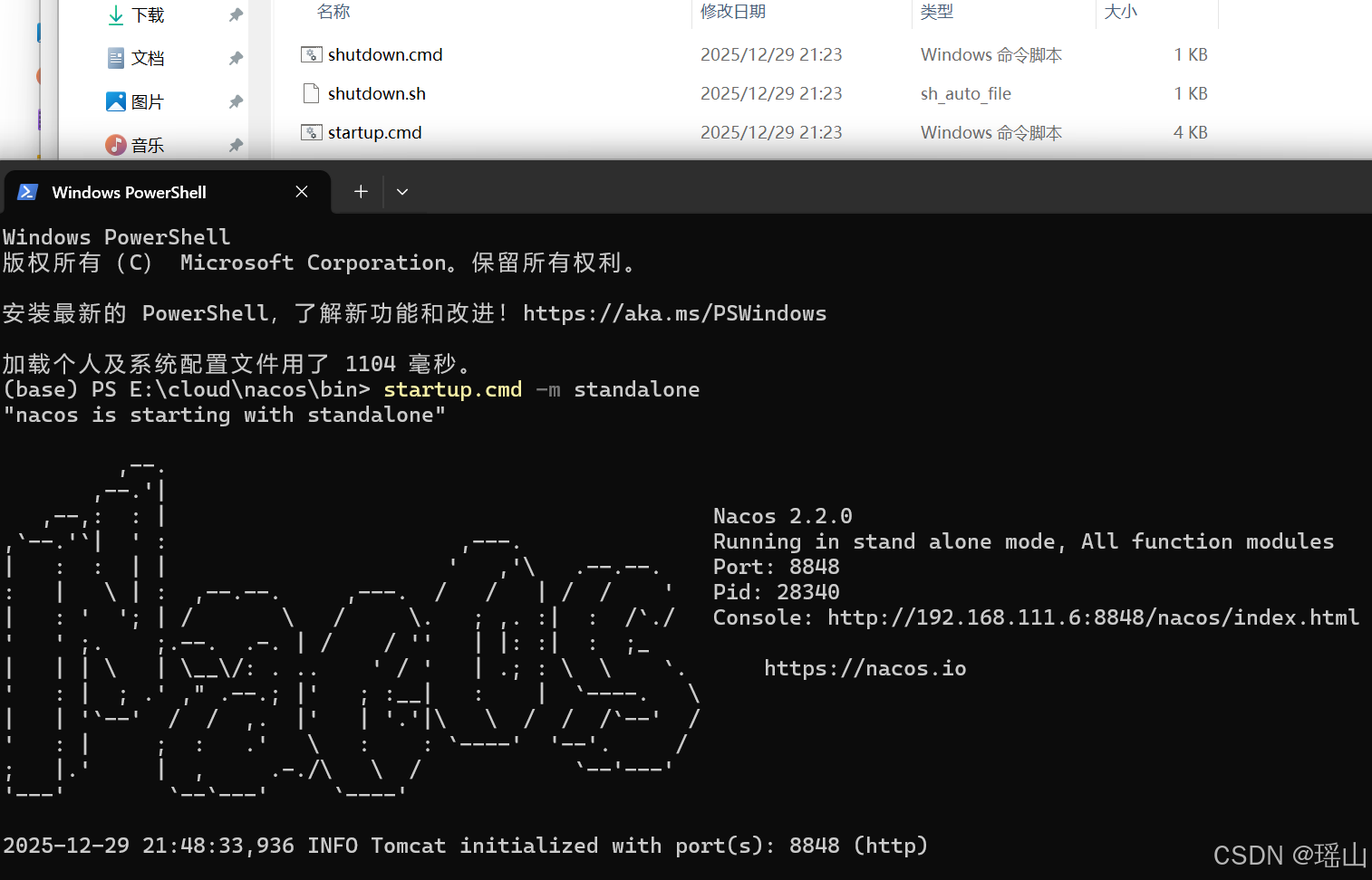 下载对应版本的Nacos Server,到安装目录的bin目录下执行命令(standalone代表着单机模式运行,非集群模式),