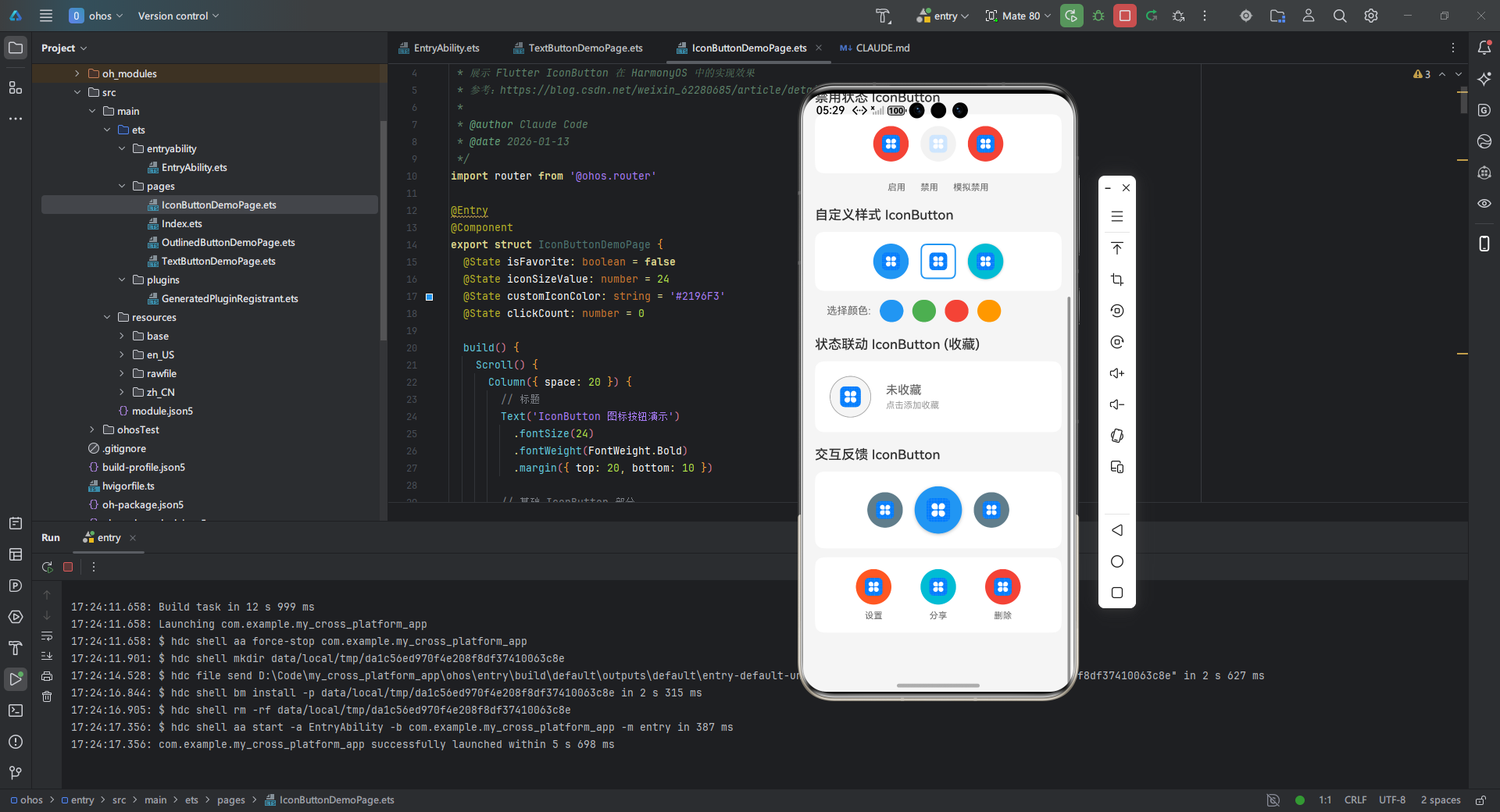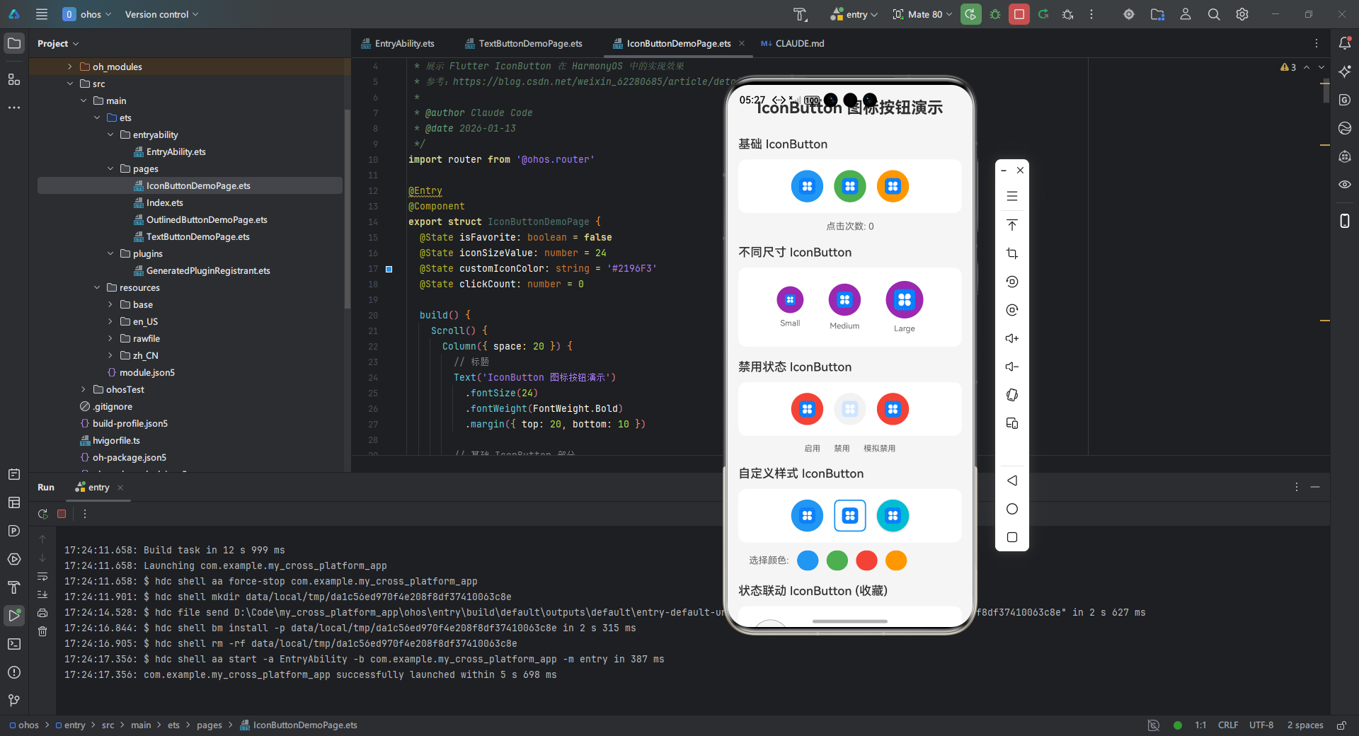 在OpenHarmony原生开发中,类似功能可通过Button或Image组件实现,但Flutter的IconButton在跨平台一致性上更具优势。以下是关键对比: