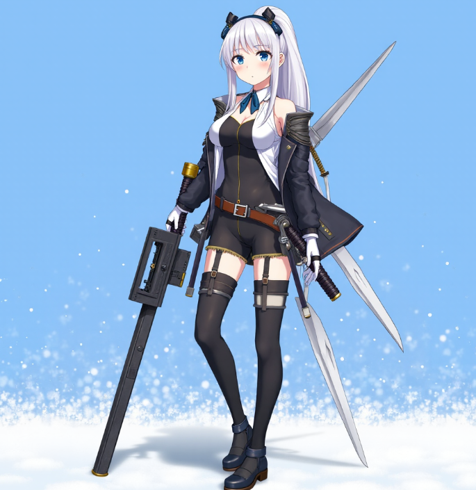 1girls, blue_eyes, weapon, full body, sky, boobs, looking at viewer, black pants, parted lips, white hair, bangs, white gloves, black gloves, holding, black footwear, snow, long hair, black jacket, long sleeve, photoshop (medium), thigh boots, holding weapon, long gloves, black_blouse, holding sword, solo, parted_bangs, cleavage, black leotard, sfw, leotard, bare shoulder, holding gun, ponytail, jacket, weapon over shoulder, bare arms, large_breasts, armpit, hair ornament, white blouse, thighhighs, long ponytail, original, blue sky, hair between eyes, gun, black hair, gloves, white hairband, black hairband, armour, swords, snowing, white hairband, 1other, long hair tied low, blue hairband, hairband, snowing hairband, blush, weapon on shoulder, black gloves, weapon on head, hair accessory, thigh strap, tits apart, hair between breasts, weapon on headwear, white_gloves, holding weapon over shoulder, weapon over head, snowing hair, hair between fingers, pants, hair intakes, blue eyes, armour on shoulders, white hairband, hair between legs, holding weapon over head, hair between thighs, armour_between_breasts, holding weapon between legs, hair between, hair between elbows, armour on forearms, armour_between