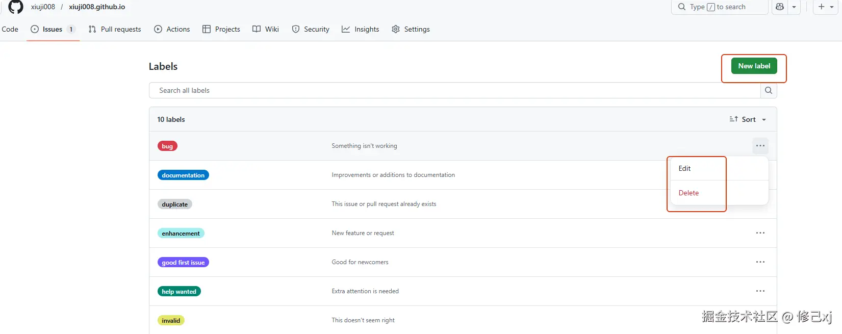 issue页签, 点击右侧Labels后边的设置按钮,点击Edit labels