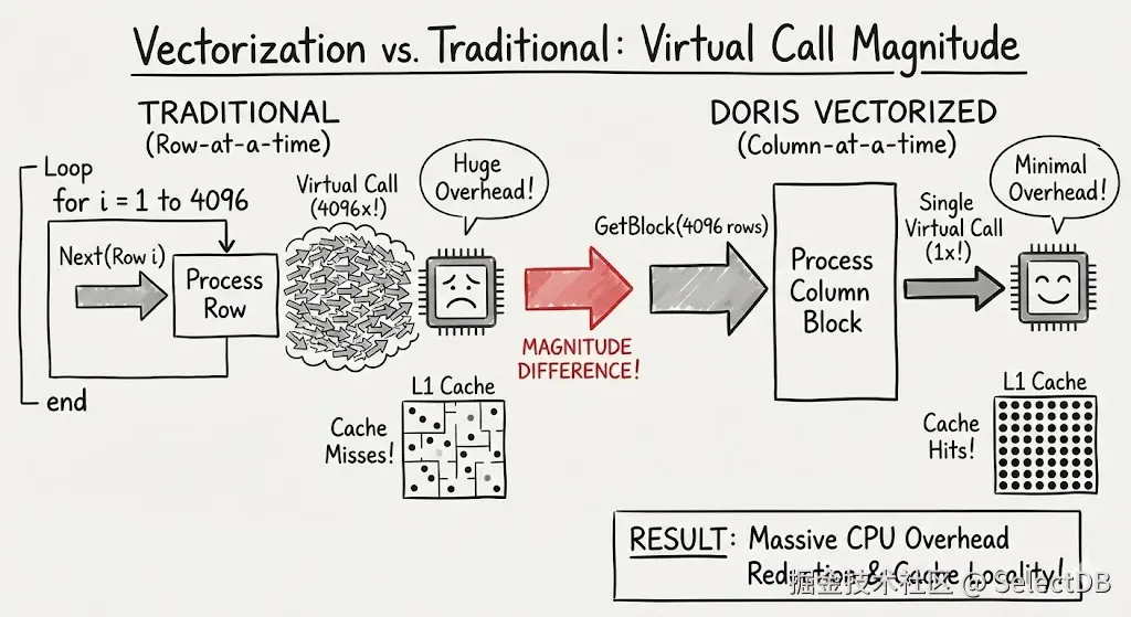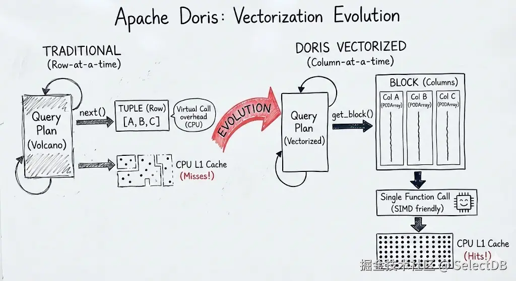 挑战是明确的:如何消除虚函数和分支预测带来的开销?如何让内存访问模式更适配 CPU 缓存?如何在高并发下避免锁与调度成为瓶颈?Doris 的应对策略清晰而系统: