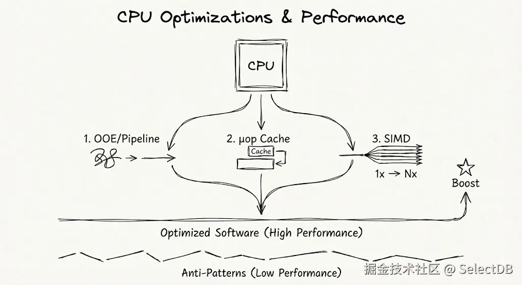 现代的 CPU 架构中,存在着大量激进如"黑科技"般的优化手段,例如指令乱序发射(OOE)、多级流水线、向量指令集(AVX、Neon、SVE)。它们能够使你的代码在同等的算力下性能倍增------前提是,你没有反模式。