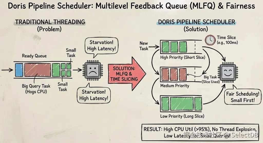 这种机制使得 Doris 在高并发混合负载下,CPU 利用率能够稳定维持在 95% 以上,且完全避免了线程爆炸(Thread Explosion)导致的系统抖动。