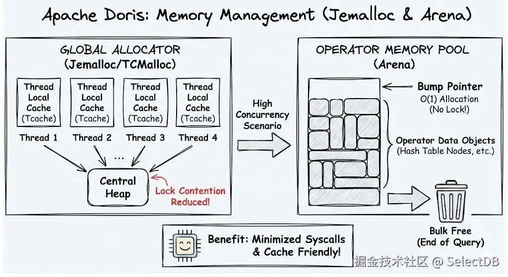 但在查询执行内部,Doris 并没有止步于此。在执行算子(如 Hash Join、Aggregation)时,Doris 使用 Arena(区域内存池)模式,这是因为很多对象的生命周期和"查询"绑定,完全可以在查询结束时统一回收。这直接带来了若干收益: