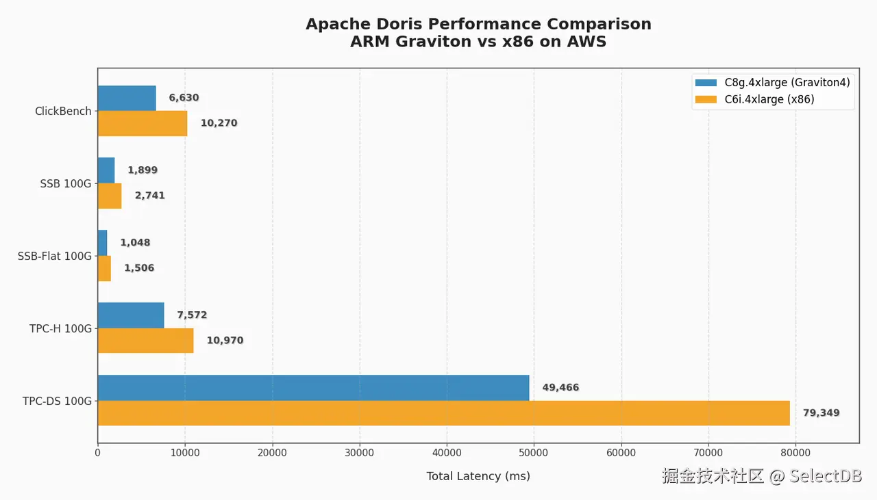 因此,性能优化必须从"算法优化"下沉为"与硬件和编译器的对话"。Apache Doris(及其商业化版本)不断在各类主流 benchmark 上取得令人惊叹的领先(例如,ClickBench#1,JsonBench#1,RtaBench#1),背后正是这些与现代硬件体系协同进步的决心。
