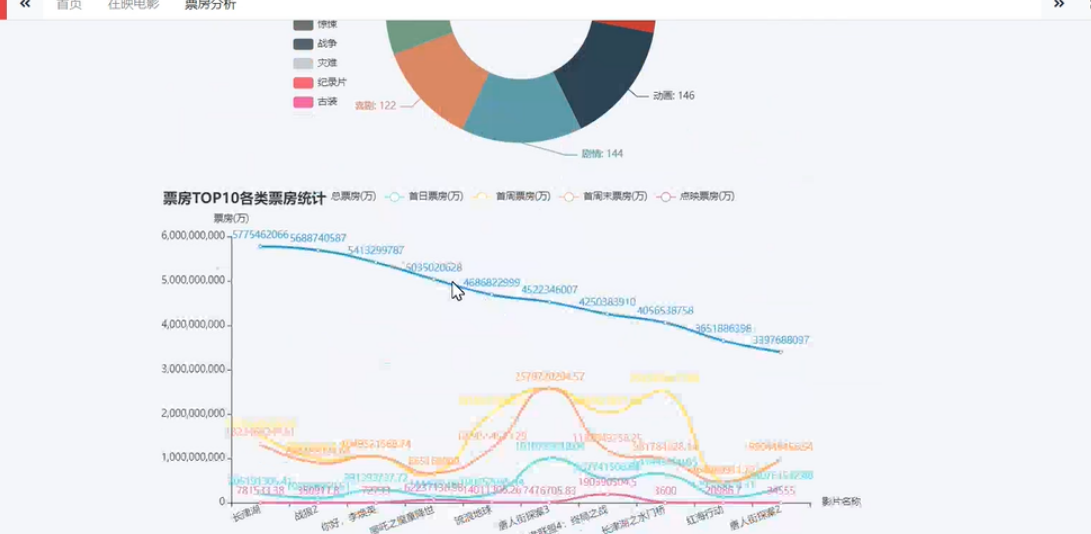 2、在系统登陆成功之后要进行在映电影的分析、票房分析、电影数据等功能相关性的数据统计,当然,为了使用方便这些统计型的数据最好是能够使用清清楚楚的图表来进行表达。