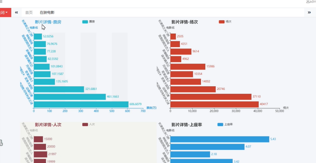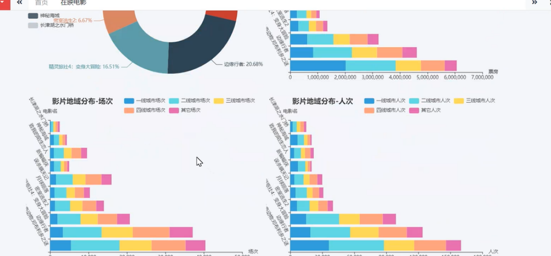 通过在映电影功能,我们可以看到在映电影目前的影片详情以及影片场次和影片人次,以及影片的上座率。通过不同角度的分析,将每个电影的各个层次进行角度分析,也可以说是鼠标属性和指标的一个罗列。同时为了能够区分这些形式,我们把传统的表格形式变成了图表的形式,这样更加清楚。