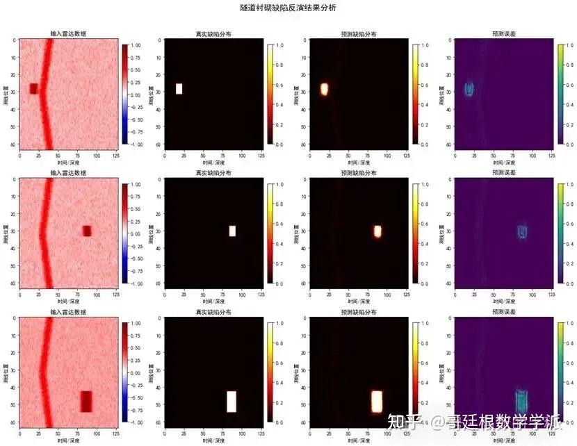 第四步:评估与应用。训练完成后,使用完全未参与训练的测试集对模型进行最终评估。通过计算均方误差等量化指标客观衡量反演精度,并通过绘制"雷达信号-真实缺陷-预测缺陷-误差"的对比图,进行定性、直观的效果分析。最后,将训练好的生成器模型保存,形成一个可以接收新地质雷达数据并自动输出缺陷分布图的智能反演工具。