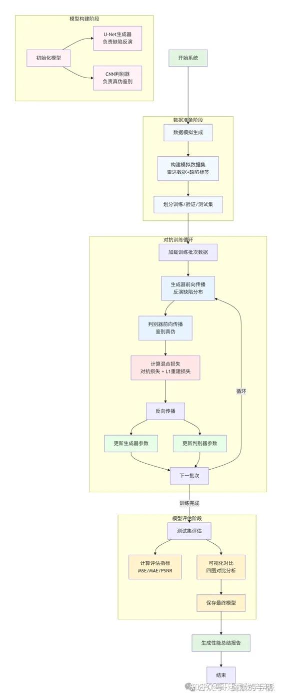 第二步:模型构建。设计一个混合神经网络架构。生成器采用具有编码器-解码器结构的U-Net网络,其编码器逐步下采样提取雷达信号的多层次特征,解码器通过上采样和跳跃连接融合深浅层特征,最终输出与输入尺寸相同的缺陷分布图。判别器则是一个深度卷积网络,负责接收"雷达信号与缺陷图的组合",并输出一个判断其为真实样本或生成样本的概率分数。