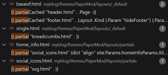 2、然后是 layouts/partials/ 目录,里面存放着可重复使用的模板片段,类似函数或者子模块的功能,里面常见的模板有:导航栏(navbar),页脚(footer),侧边栏,SEO meta 标签等,以及任何想在多个页面中复用的代码块,其他模板可以通过 {``{ partial "filename.html" . }} 对该模板进行调用(Go 模板系统),也可以传入上下文 (.)或自定义数据(比如字典)等,很灵活,比如