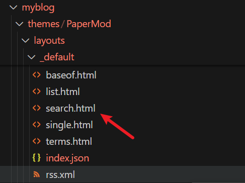 下面先来看搜索功能的模板文件 search.html,和之前介绍的面包屑 breadcrumbs.html 功能不同,breadcrumbs.html 是位于 layouts/partials/ 目录下,而 search.html 是位于 layouts/_default/ 目录中