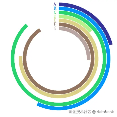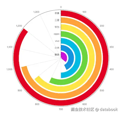 圆形条形图 从同一基准线开始,避免了径向条形图中不同角度起始点不同的问题,更加便于比较。