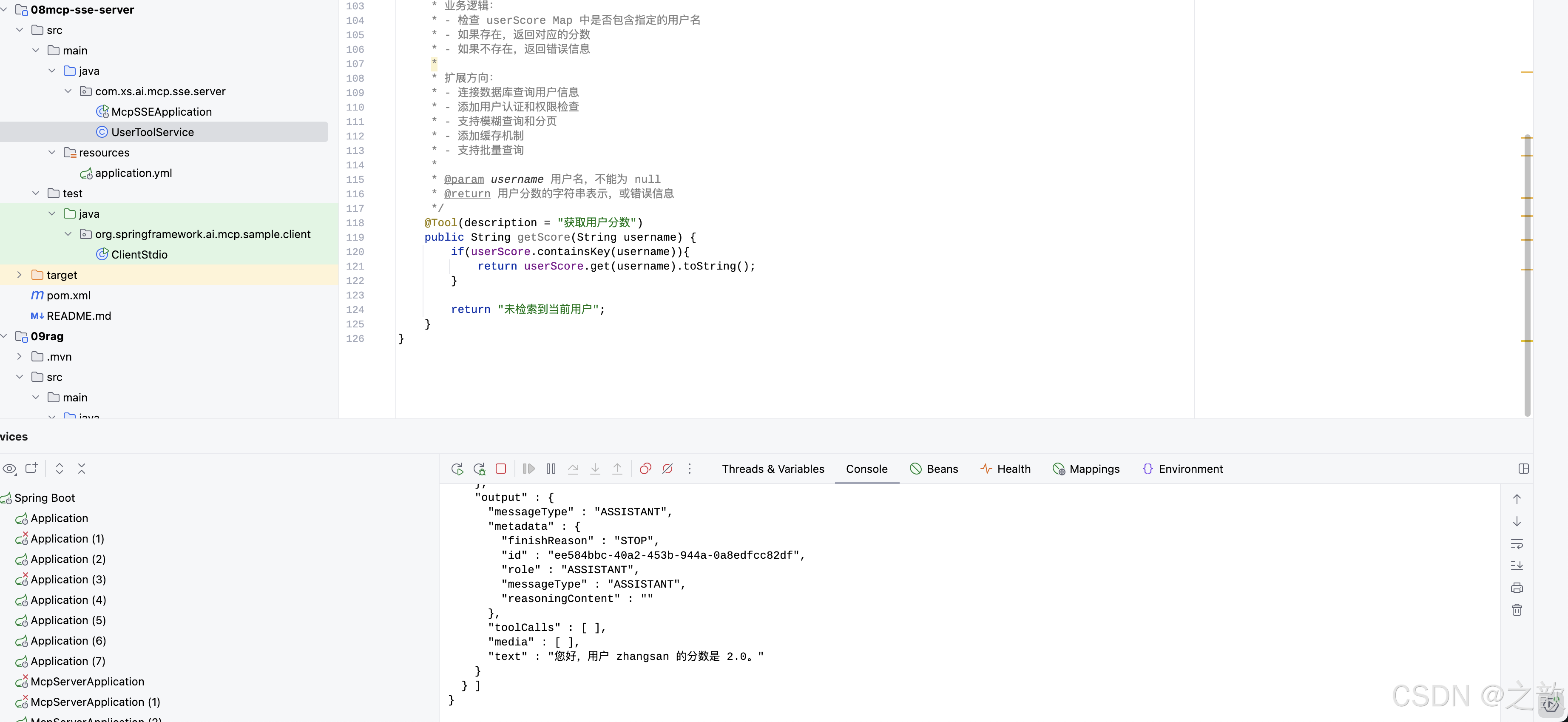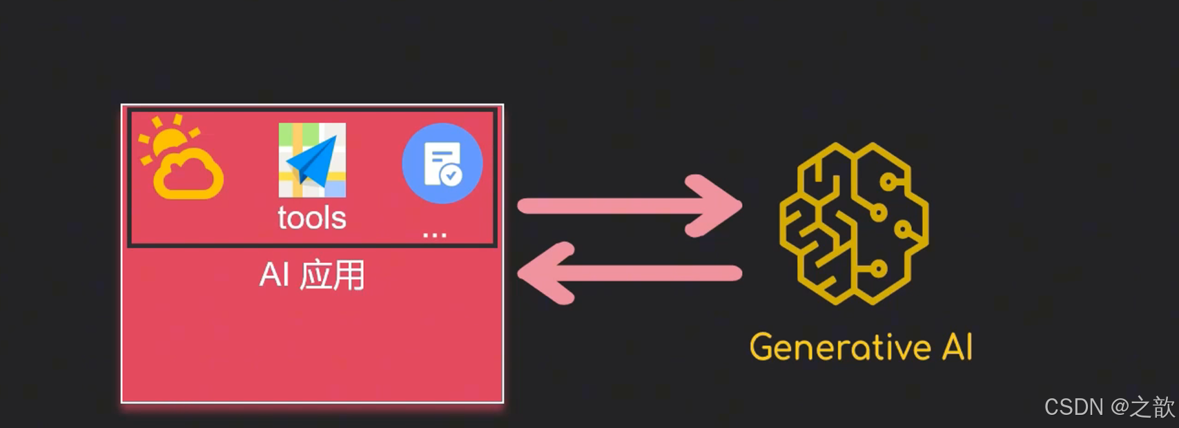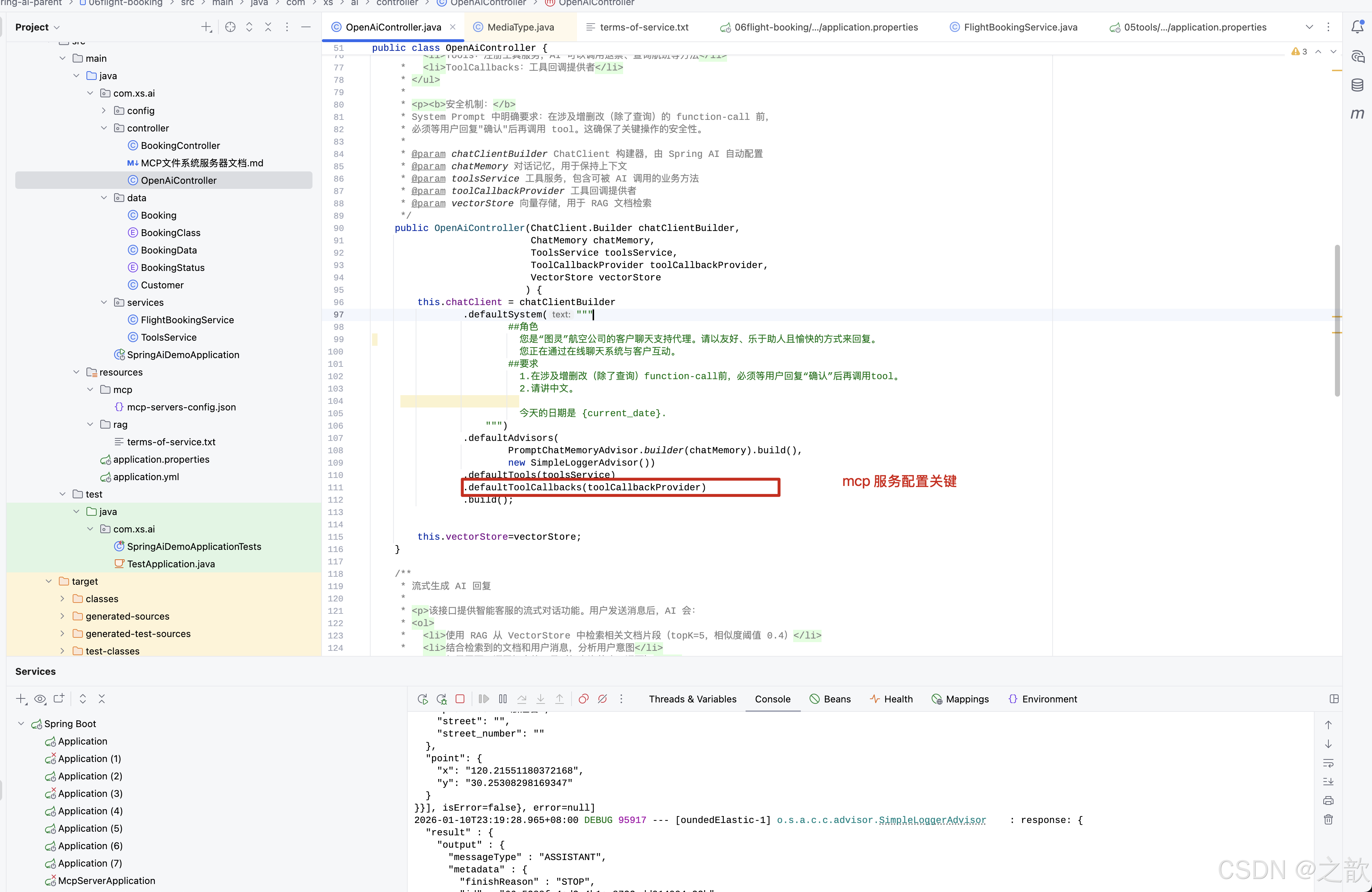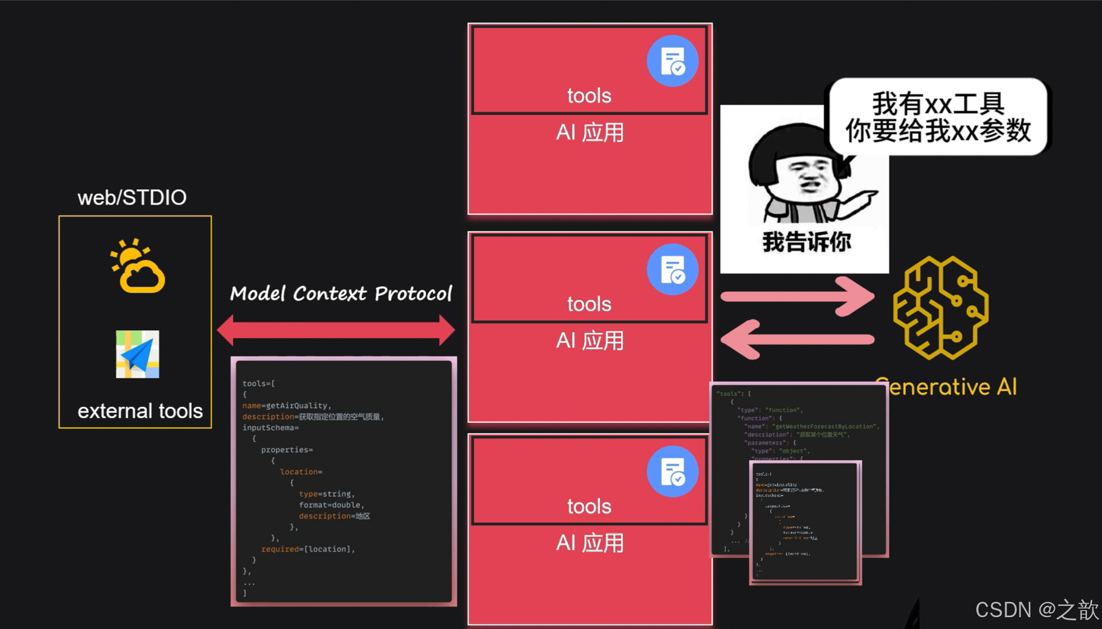 我自己业务系统当中的一些信息,他肯定是不知道的,我们就需要通过function-Call,或者叫做TOOlS来进行实现,这样呢就可以让大模型,间接的去调用我们系统当中的方法,从而呢去查询第三方的天气接口,或者说昵去查询地图信息,去查询我们自己业务的一些信息,想要基础大模型具备这个功能呢,首先我们得告诉大模型,我们系统当中提供7哪些工具,以及你要调用我这个工具呢,需要提供什么信息给我,就此如说我们需要查询天气,那你要调用我这工具呢,麻烦提供OCatjon位置给我,如果你有多个AI应用,是不是就会出现一些重复的工作量,那我们单个ai应用,是不是就形成了信息的孤岛呢,那外部的这个tool服务呢