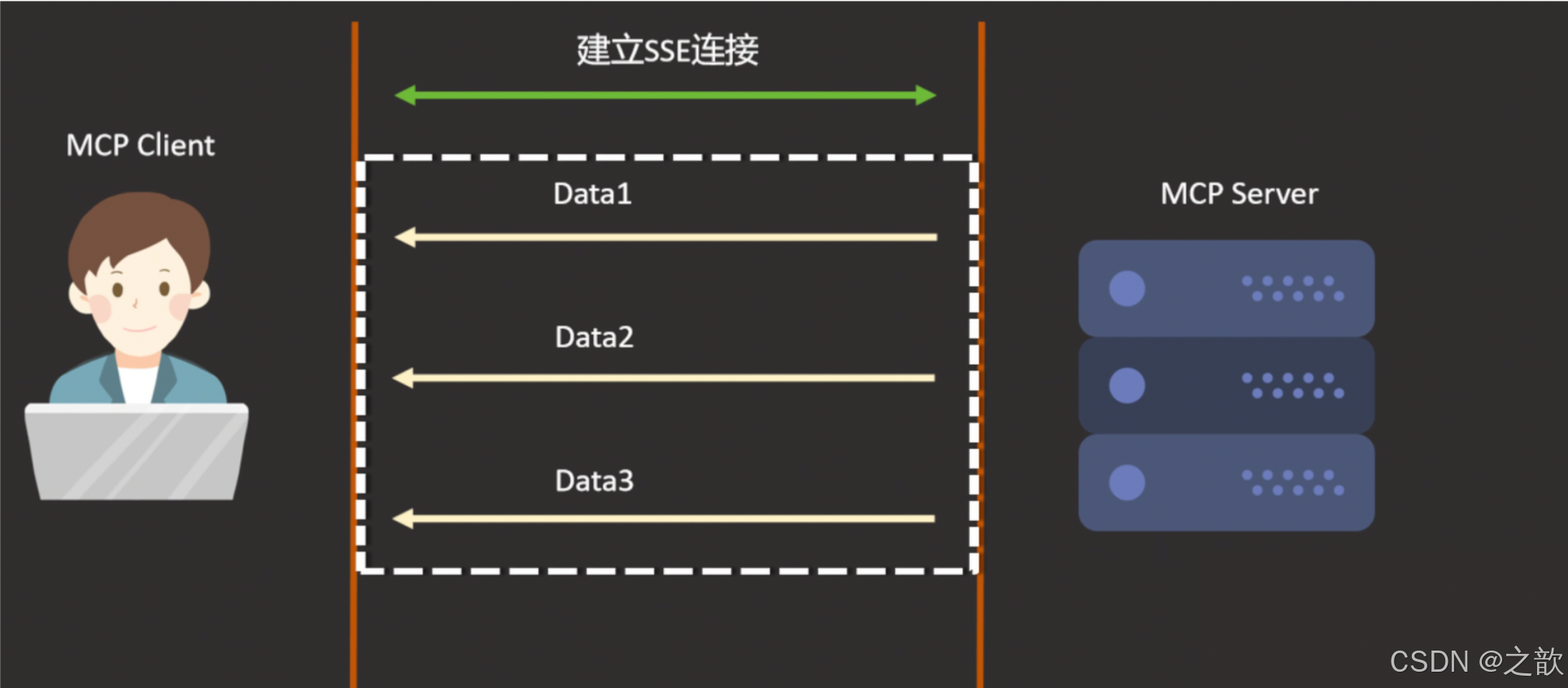 是SSE首先,建立一个SSE的长链接,那的本质呢,依然是通过HTTP的TCP通信方式,会进行三次握手,那么当长链接建立完之后,MCP服务端就可以不断的向客户端,单向的去发送数据,