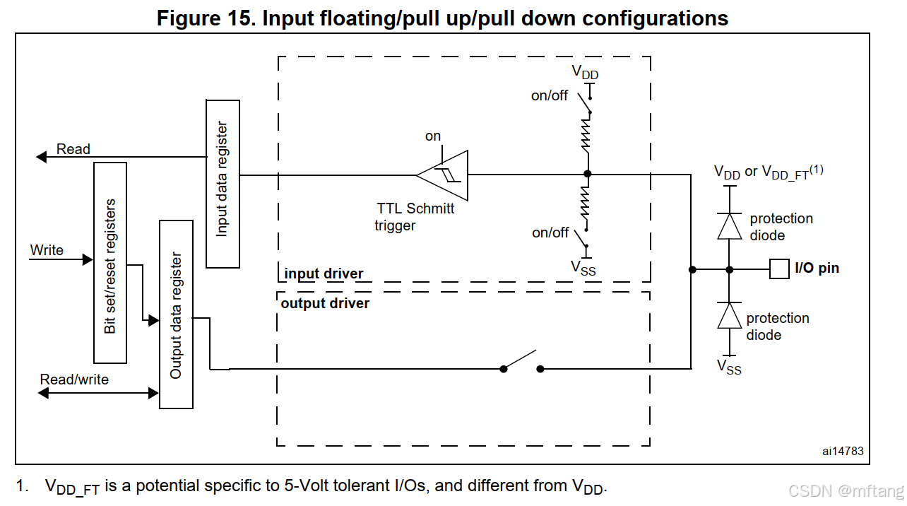 原理:上拉电阻可以接到一个与MCU VDD不同的电压(如5V)。当引脚输出高阻态时,总线电平被上拉到5V;输出低时,则拉低到0V。这样,一个3.3V的MCU就可以安全地与5V器件通信。