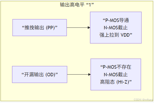 | 输出高电平的实现 | 主动上拉 至 VDD | 断开(高阻态),依赖外部上拉电阻 |