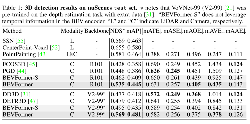 本文提出了BEVFormer,可以通过预定义的grid形式(bev)的query在时间和空间上做交互来实现最大化信息利用。空间上的交互即bev的query利用空间交叉注意力和不同的摄像头的对应区域的特征做交互,时间上的交互即利用bev的query利用时间自注意力上和之前此位置的的bev特征做交互。在nuscences上NDS达到56.9,和pointpillar还有一定差距,但效果已经非常好了。