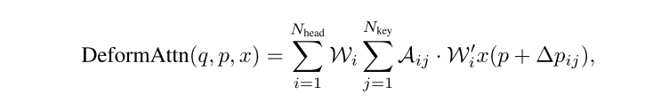 DETR(训练太慢), Deformable DETR提出deformable attention,只在参考点附近采样几个点实现只做局部区域的注意力,效率更高,训练更快。Deformable attention公式如下,本文沿用Deformable attention但是拓展到了3D领域。