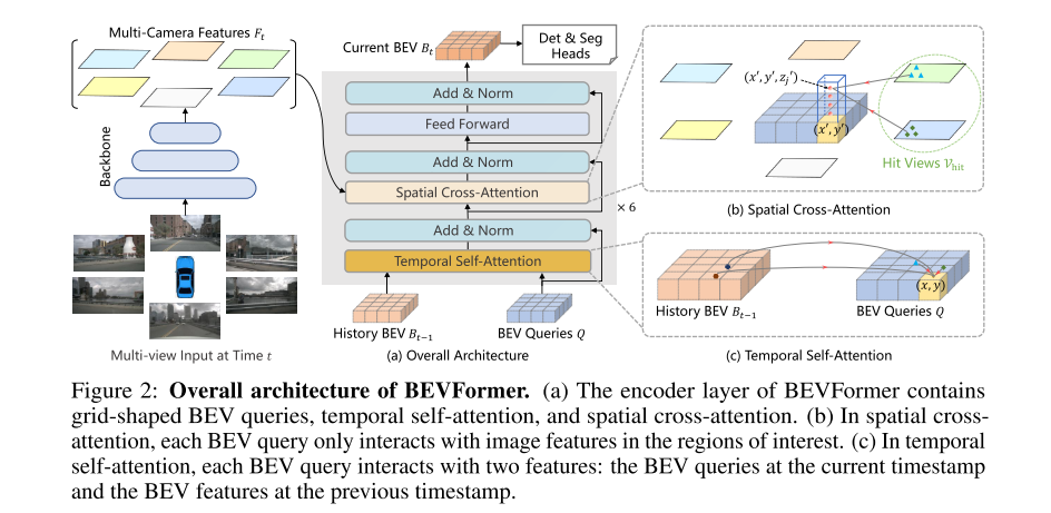 2)设计的可学习的BEV query以及附带的空间交叉注意力和时间自注意力可以分别实现多相机信息交互和历史BEV特征交互,然后把他们聚合到统一的BEV特征中。